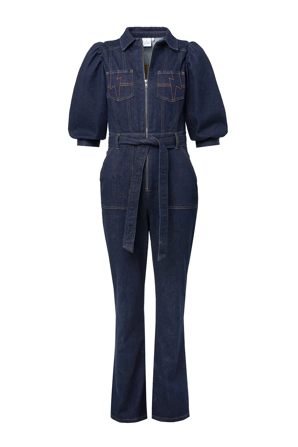 Your weekend wardrobe is calling out for our dreamy rinse wash denim flared leg jumpsuit. This hero piece is fitted at the top, slim through the hip and thigh with a flared leg. The effortless all-in-one jumpsuit takes the drama out of getting dressed. Styling couldn't be simpler - just add jewellery and a pair of trainers, cowboy boots for a western look, or opt for a pair of clogs for a 70s inspired look. Available in regular and a long length Zip front Tie waist Flared leg shape Pretty puff sleeves Patch front pockets which open at the side seam Breast and back pockets with embroidered lightning bolt feature Signature neon pink embroidered lightning bolt on the shoulder Our denim laundry process is carefully monitored to ensure our denim has the lowest environmental impact we can achieve and the manufacturing process maximises water reduction and energy efficiency. Using the latest technology we can use up to 80% less water and use 60% less harmful chemicals. Model in image 1 is Size 16 Height 5' 7 1/2" Wearing a size 16 long Model in image 2 is Size 8 Height 5'9 Wearing a size 8 long Discover more Scamp & Dude jumpsuits.
