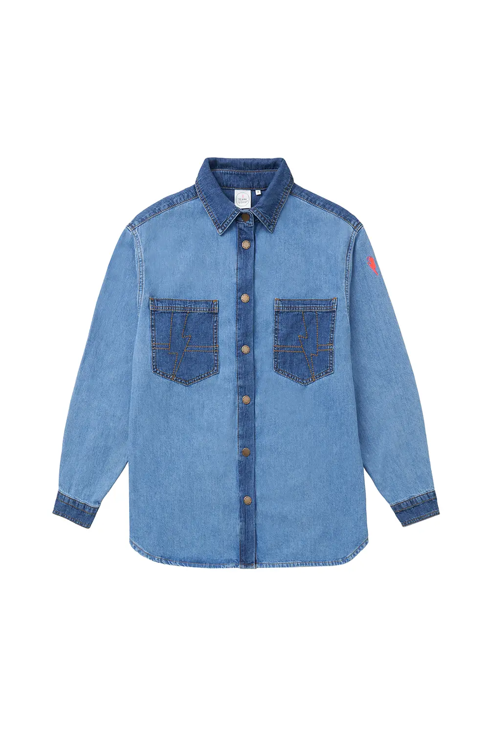 Our oversized denim shirt is perfect, for all year round. The pockets feature our signature embroidered lightning bolt design for a superpowered finish. The fit is slightly oversized, for layering or as a solo statement. Pair yours with a leopard maxi skirt for a cool but comfortable look. Responsibly sourced cotton Oversized relaxed fit Can be worn as a shirt or layering piece Contrast wash on collar, pockets, button placket and cuffs Front pockets with signature embroidered lightning bolt Button through placket Curved hem Contrast neon details Signature neon pink embroidered lightning bolt on the sleeve Our denim laundry process is carefully monitored to ensure our denim has the lowest environmental impact we can achieve and the manufacturing process maximises water reduction and energy efficiency. Using the latest technology we can use up to 80% less water and use 60% less harmful chemicals. Model in the image is Size 8 Height 5'9 Wearing a size 8