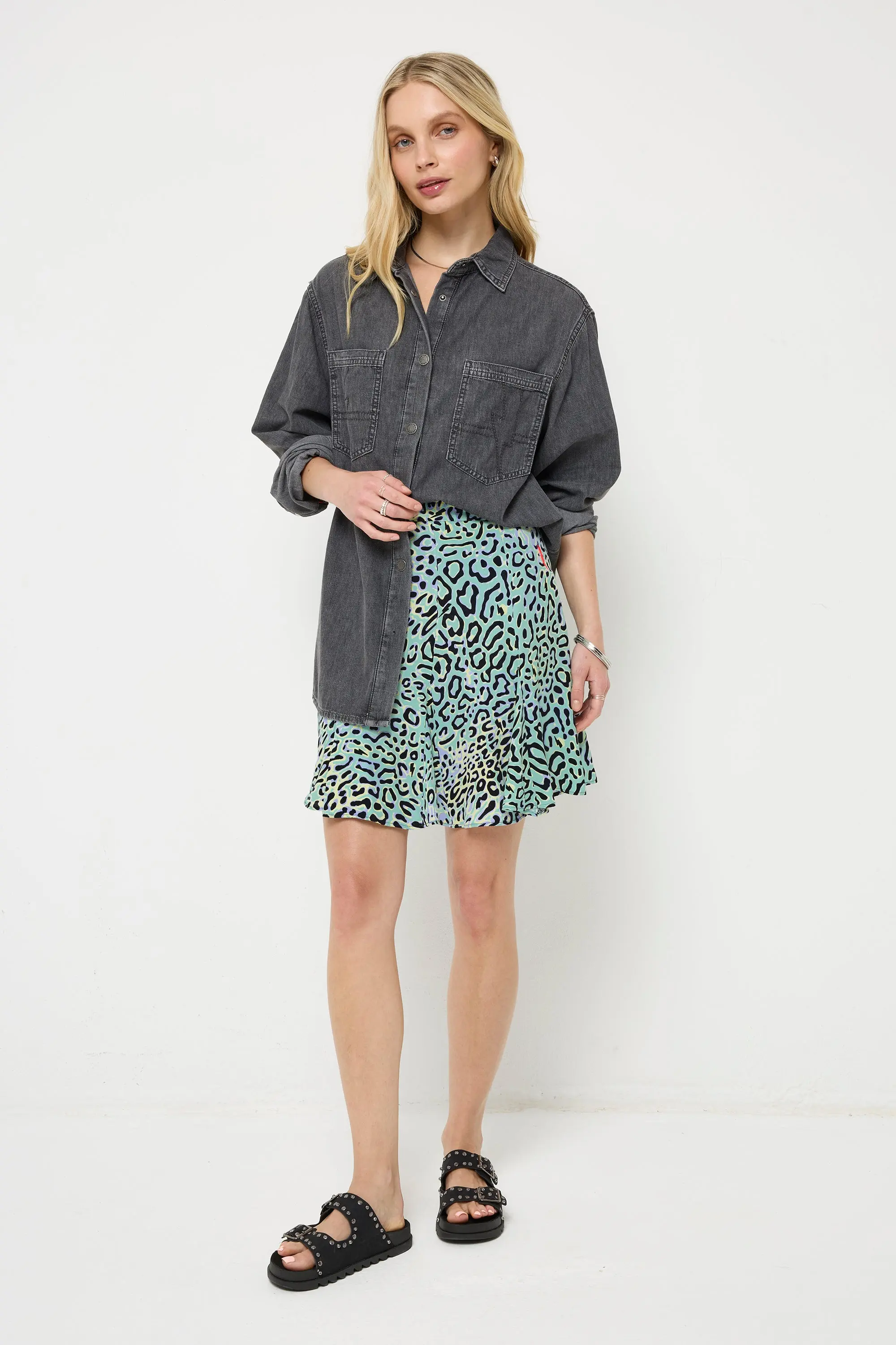 Our oversized denim shirt is perfect, for all year round. The pockets feature our signature embroidered lightning bolt design for a superpowered finish. The fit is slightly oversized, for layering or as a solo statement. Pair yours with a leopard maxi skirt for a cool but comfortable look. Responsibly sourced cotton Oversized relaxed fit Can be worn as a shirt or layering piece Front pockets with signature embroidered lightning bolt Button through placket Curved hem Contrast neon details Signature neon pink embroidered lightning bolt on the sleeve Our denim laundry process is carefully monitored to ensure our denim has the lowest environmental impact we can achieve and the manufacturing process maximises water reduction and energy efficiency. Using the latest technology we can use up to 80% less water and use 60% less harmful chemicals. Model in the image is Size 8 Height 5'5 Wearing a size 8