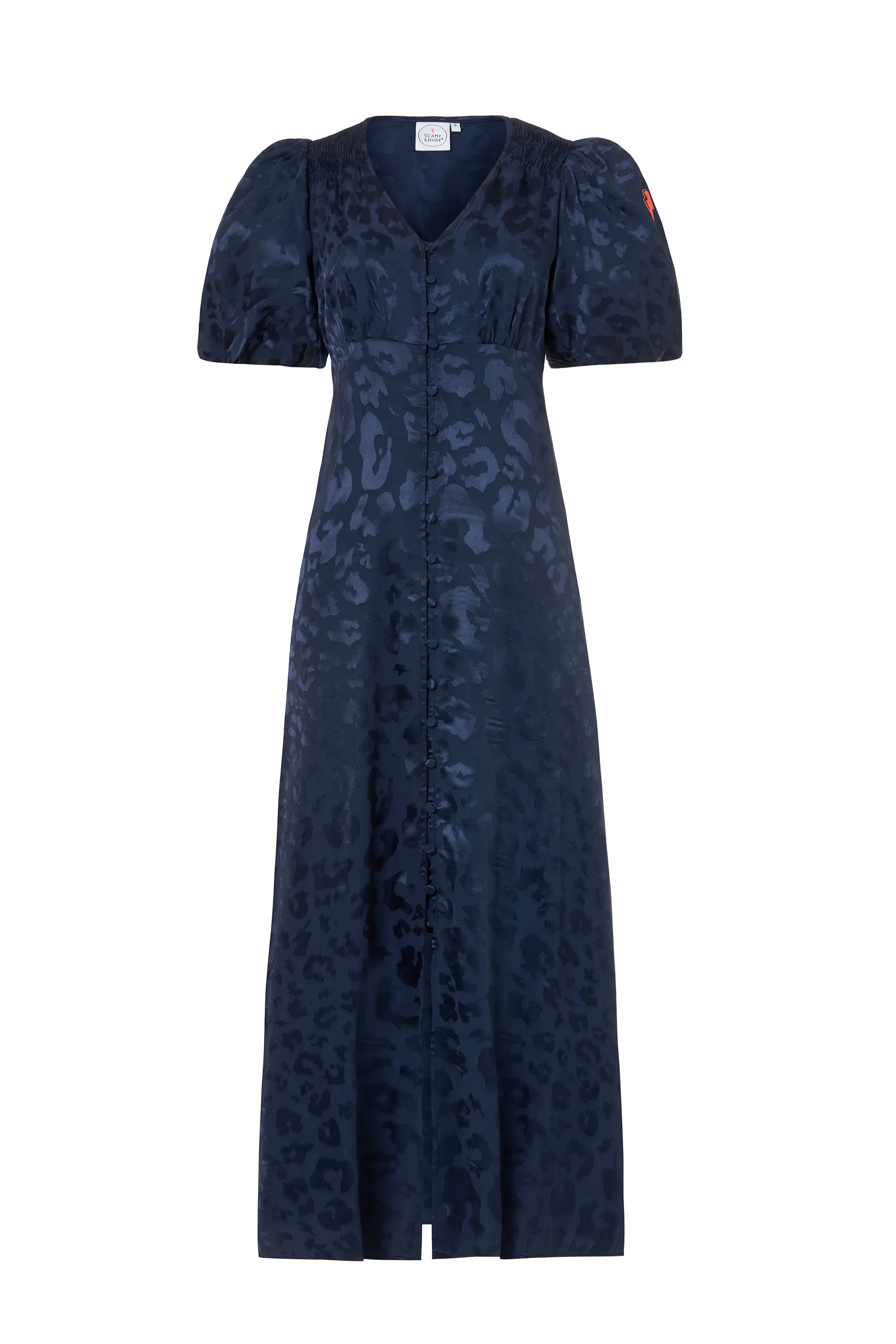 Adorned with leopard print for a mesmerising finish and elegantly cut to give a feminine silhouette, our navy jacquard puff sleeve midi tea dress is made from viscose that's beloved for its weightless feel. With a universally flattering v-neckline and short puff sleeves, this style allows you to showcase its versatility. Slinky viscose fabric with EcoVero V-neck Pretty puff sleeves Functioning button placket Empire seam Pockets Signature neon pink embroidered lightning bolt on sleeve Model in the image is Size 8 Height 5'9 1/2 Wearing a size 8 Accessorise with our Scamp & Dude x Rachel Jackson jewellery collection.