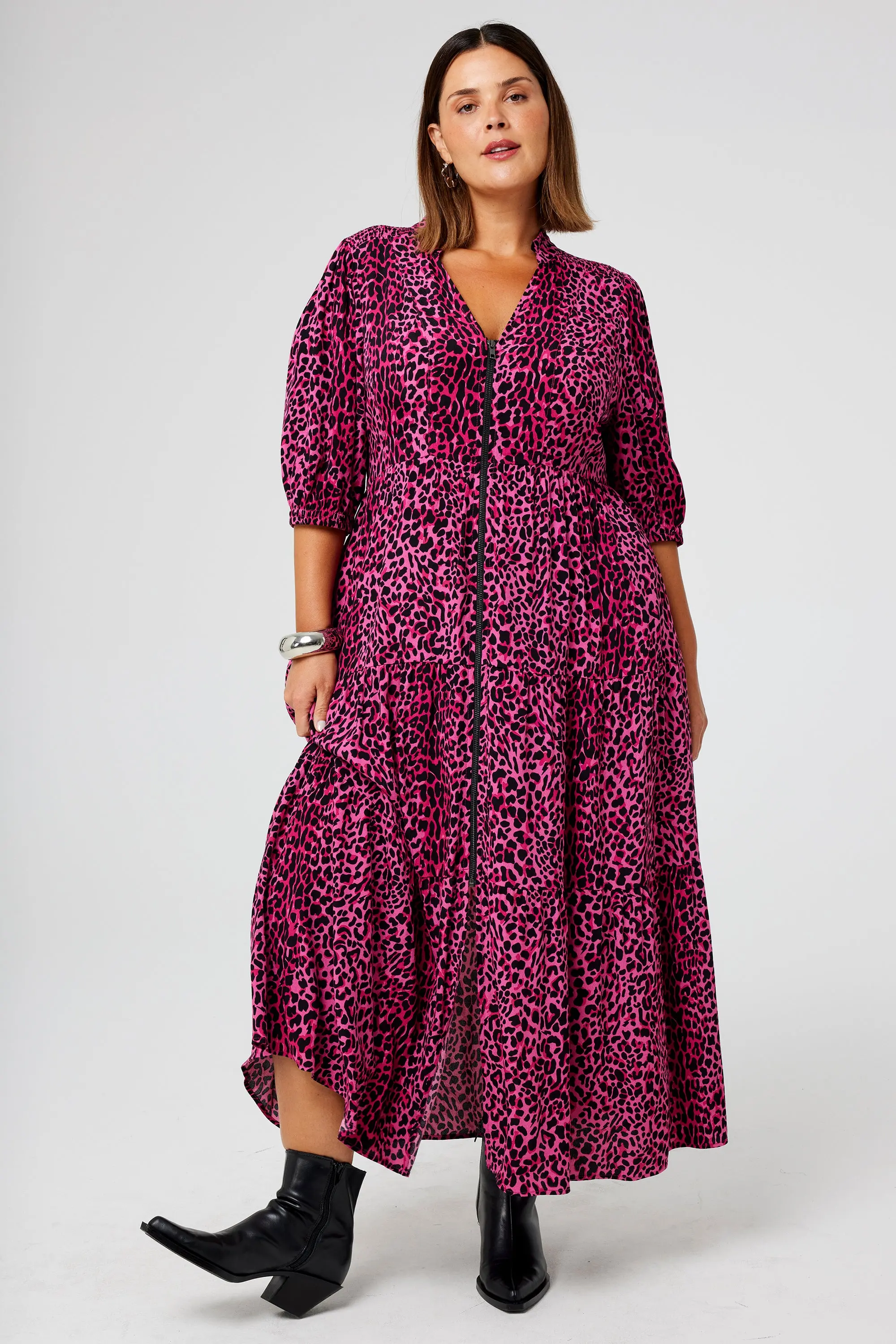 Pink with Black Wild Leopard Zip Detail Tiered Midi Dress