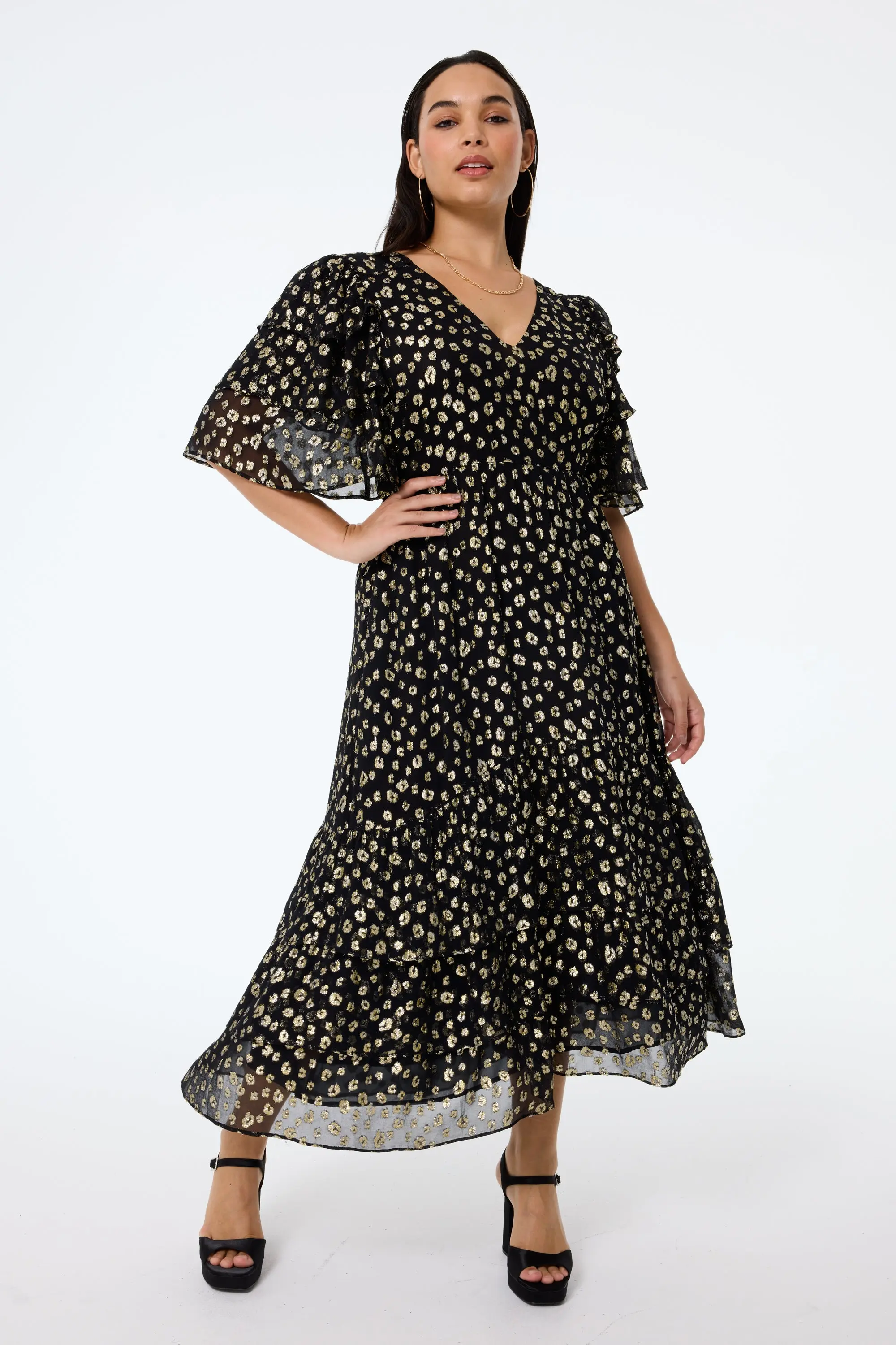 Black with Gold Spot Leopard Jacquard Ruffle Sleeve Tiered Midi Dress