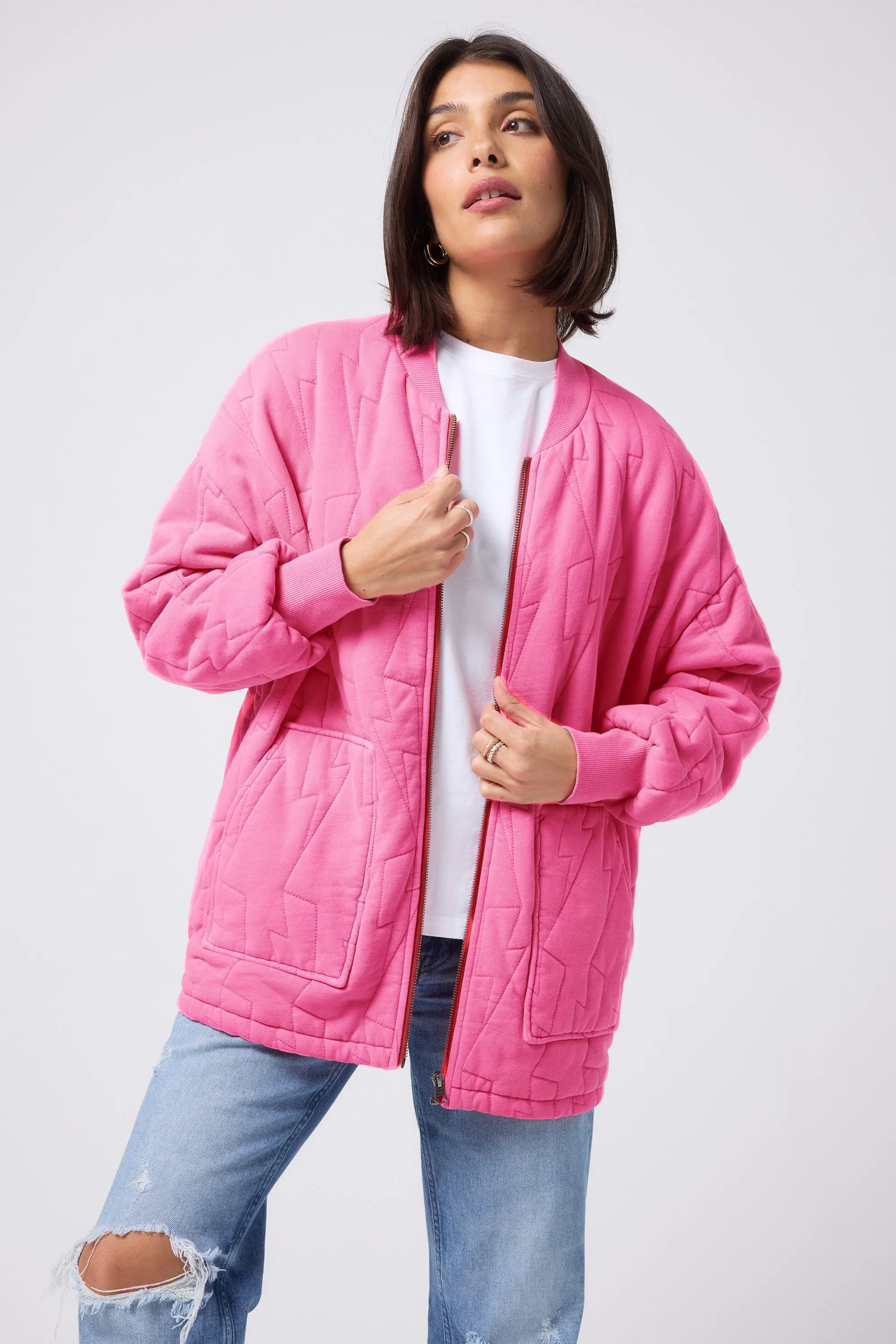 Neon Pink Lightning Bolt Oversized Quilted Bomber Jacket