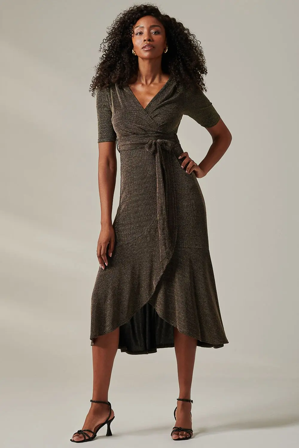Perfect for special occasions, this dress combines style and ease with a touch of shimmer.Featuring half sleeves and a flattering wrap-over v-neckline, this dress is designed to accentuate your silhouette. The self-tie waistband allows for a customizable fit, while two side pockets add practical convenience. The dress cascades down to a frill flared hemline, enhancing its graceful movement. Finished with a back zip fastening.