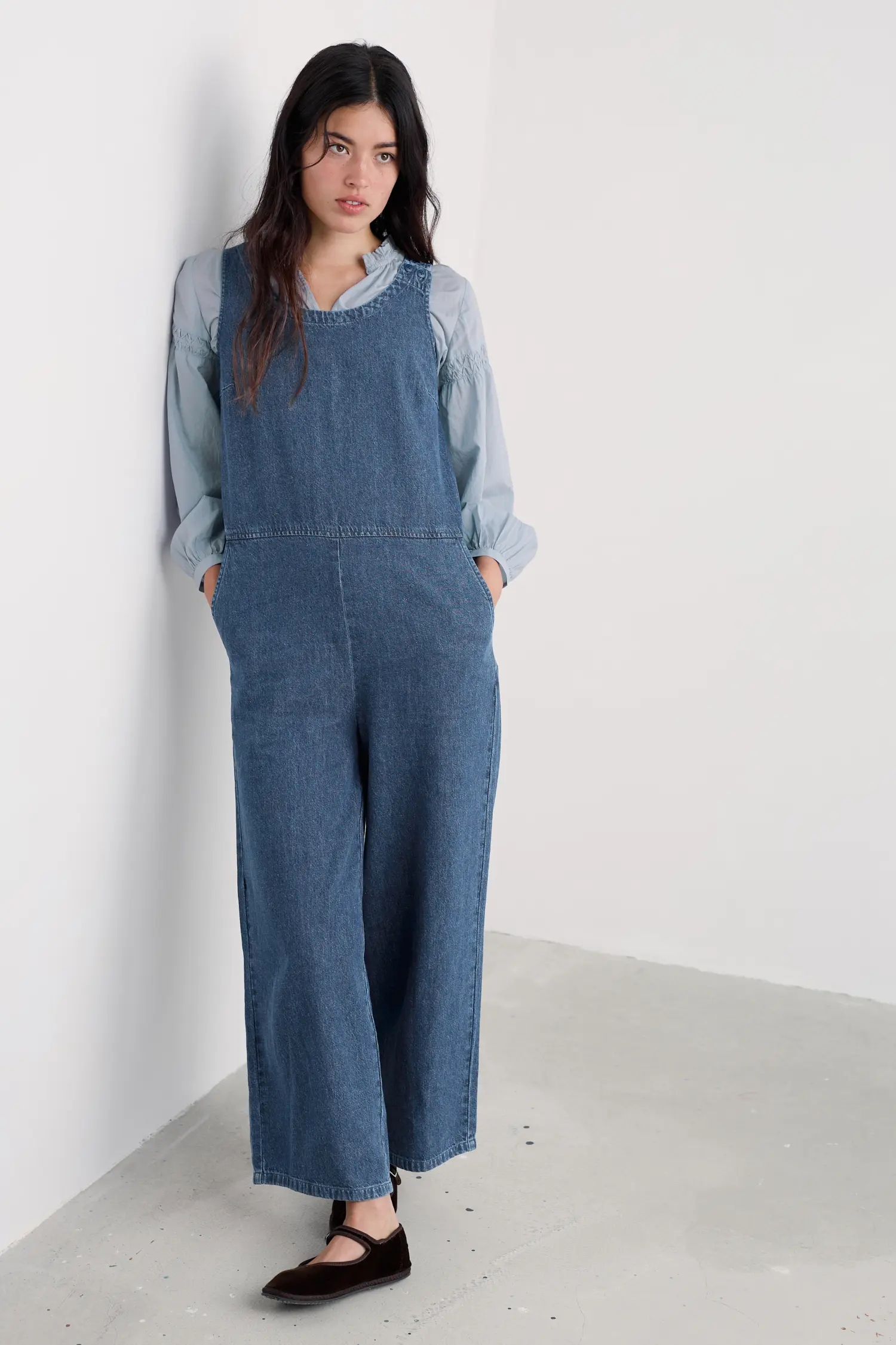 Summery wide-leg linen jumpsuit with pockets, perfect for dressing up or down.