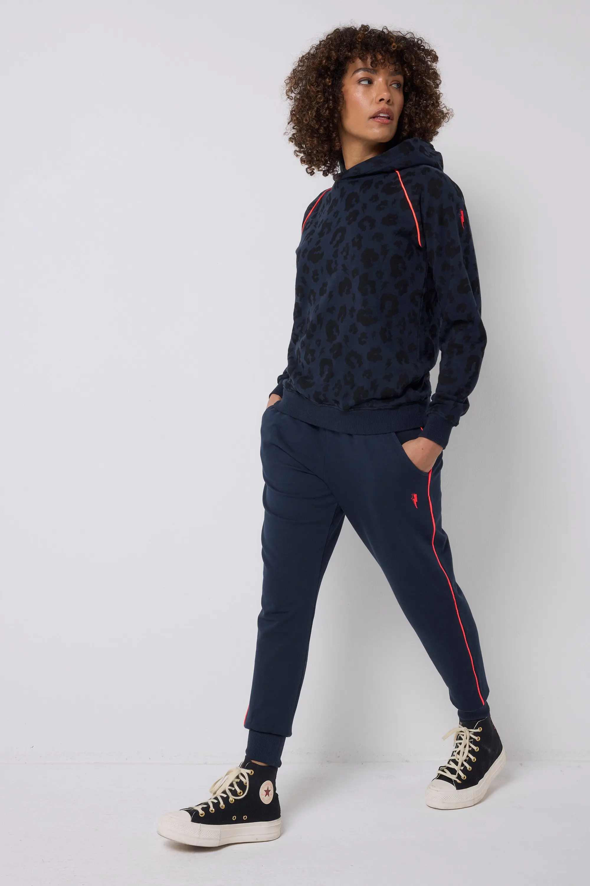 Our navy super soft cosy joggers deliver a perfect blend of comfort and style. Team them with a hoodie and a pair of trainers to run errands on the weekend. Flattering fit Super soft, organic cotton Comfortable elastic waist Pockets Extra long soft cuff (to make them work for people 5ft up to 6ft as you can turn up the cuff or wear them unrolled depending on your height) Signature neon pink embroidered lightning bolt on the hip Model is Size 8 Height 5'8 Wearing a size 8