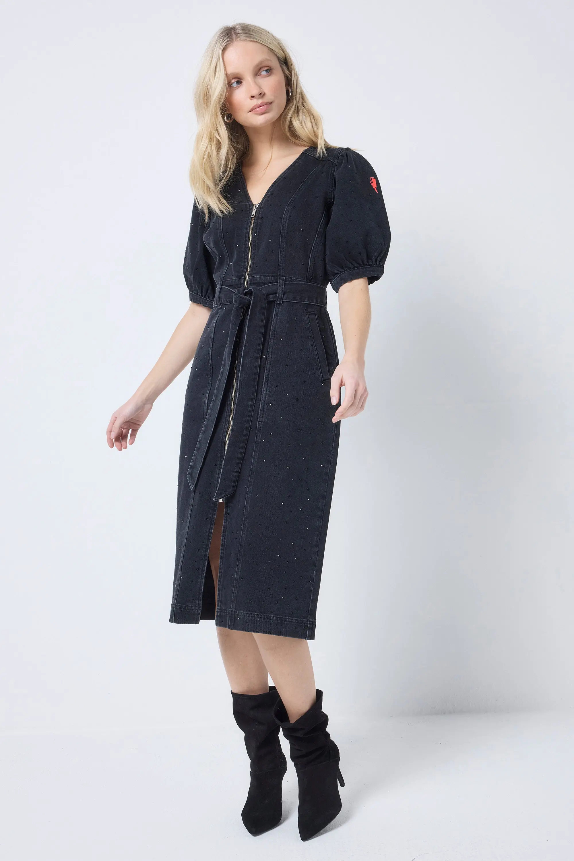 Say hello to our washed black denim dress of dreams! Universally figure flattering, super comfortable and designed to make you feel amazing, we're wearing ours everywhere. Stretch denim All over diamante embellishment V-neck Functional gunmetal long front zip Puff sleeves Removable tie front belt Pockets Signature neon pink embroidered lightning bolt on the sleeve Our denim laundry process is carefully monitored to ensure our denim has the lowest environmental impact we can achieve and the manufacturing process maximises water reduction and energy efficiency. Using the latest technology we can use up to 80% less water and use 60% less harmful chemicals. Due to the nature of the embellishment on this garment we recommend a cold hand wash. Some loss of studs can happen but to help prevent this please treat this garment as delicate. Model in image 1 is Size 8 Height 5'6 Wearing a size 8 Model in image 2 is Size 8 Height 5'8 Wearing a size 8 Our chunky cardigans are the perfect cosy layer for your denim dress this Autumn/Winter.