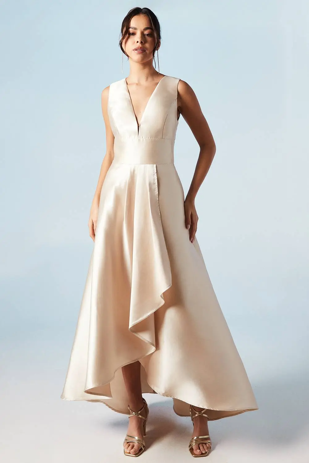 Coast Women's Honoured Sleeveless Plunge Waterfall Twill Maxi Bridesmaid Dress in Champagne