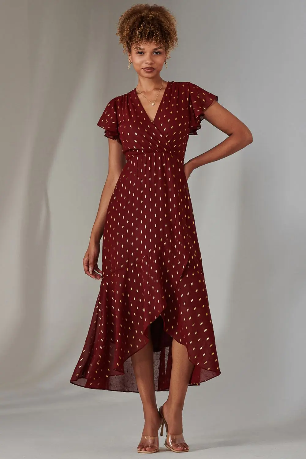 Make an entrance in Jolie Mois Metallic Spot Textured Maxi Dress. Crafted from shimmering chiffon, it features a flattering wrap-over V-neckline, romantic frill sleeves, and a tie-up belt for a perfect fit. The dress flows into a playful, layered hem that moves gracefully with every step, complemented by an elegant U-shaped tie-back for an eye-catching finish. Practical side pockets complete this stunning, event-ready look.