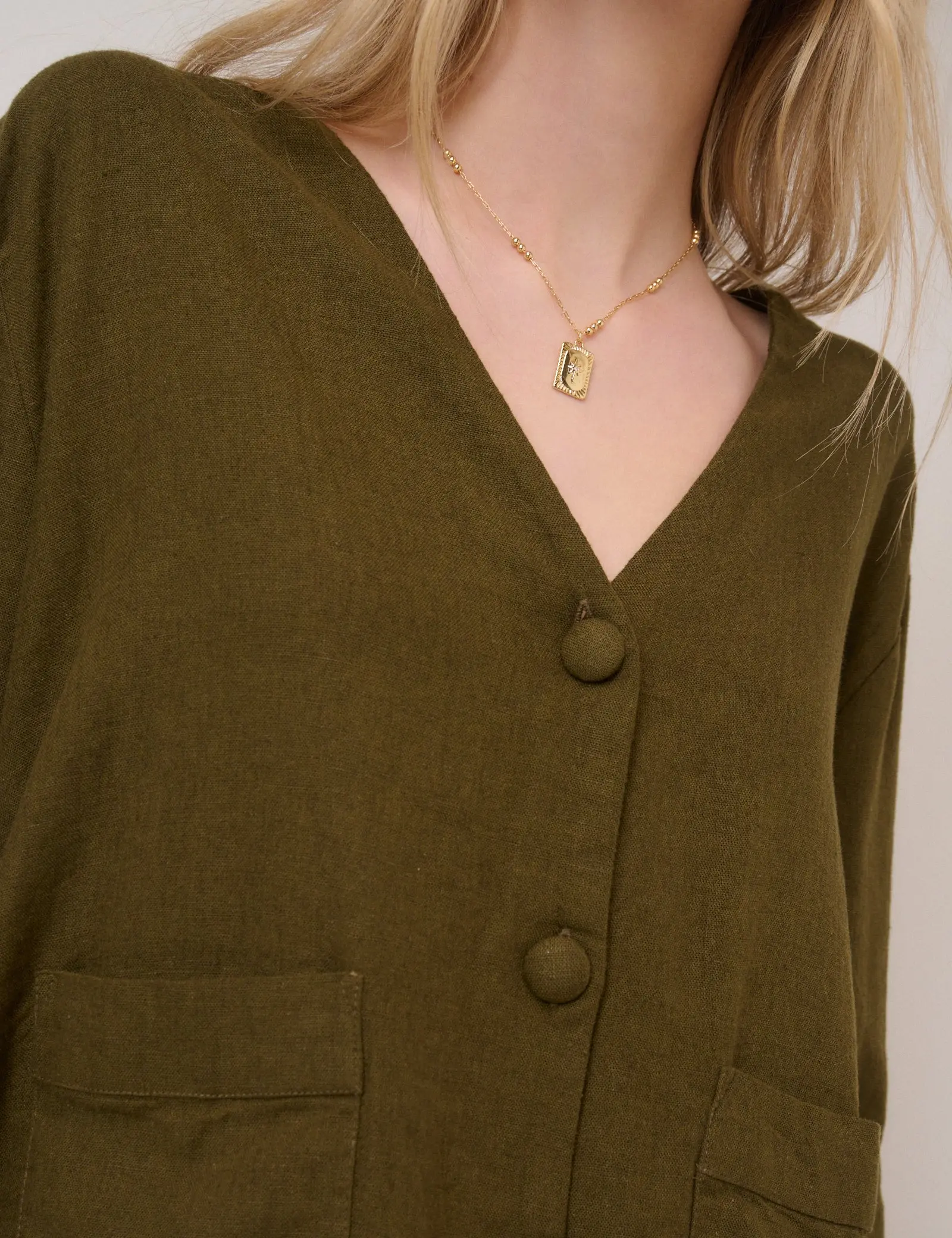 Add our boxy Bobbie shirt to your wardrobe rotation. Coming in khaki, we love the V-neckline, patch pockets and covered buttons. Mix and match her with everything else in your wardrobe. V-neck Short sleeves Button front Boxy fit
