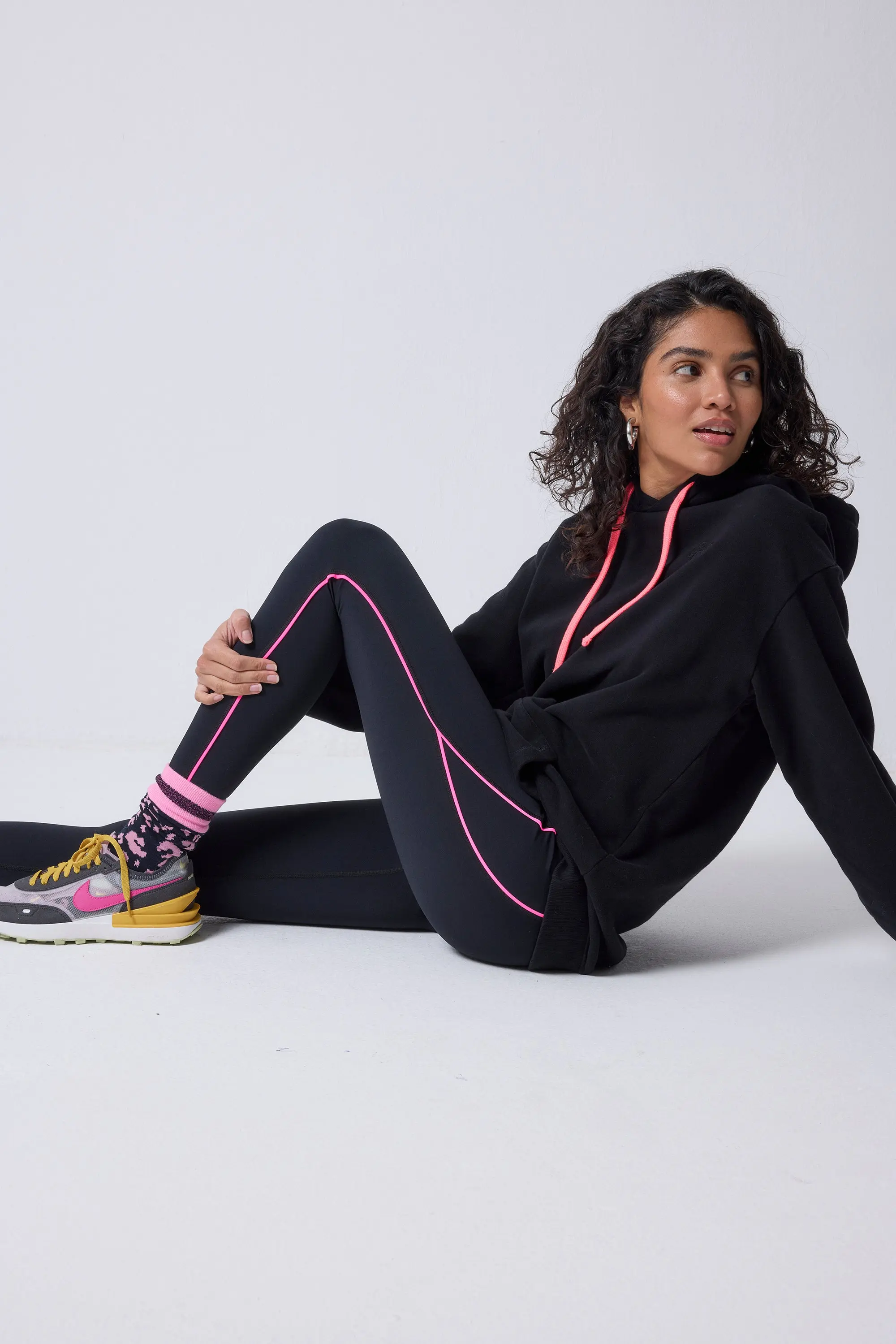 Go from studio to street in prints that perform. Our black with neon piping gym leggings are designed with sculpting four-way stretch fabric and a flattering high-rise waistband. Crafted to cinch and lift in all the right places, these leggings are set to be the show-stopping heroes of your activewear wardrobe. High waisted with a wide waistband for support Full length Sculpting 4 way stretch fabric Flattering panelling design at sides Concealed zip pocket at back waistband Non-see through and squat proof Signature neon pink embroidered lightning bolt on the top hip Discover more activewear.