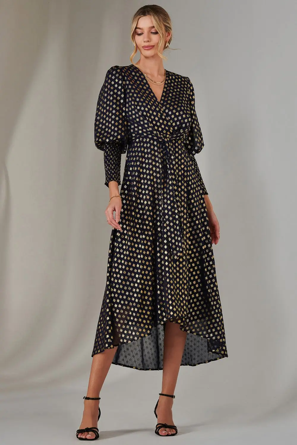 Jolie Moi Women's Metallic Spot Print Puffy Sleeve Maxi Dress in Navy