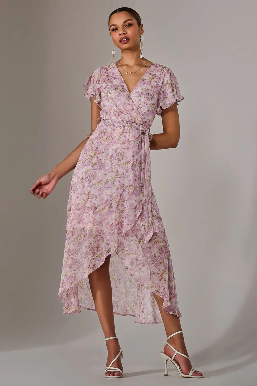 Become your most elegant self in the Chiffon wrap Midi Dress from Jolie Moi. Being the perfect balance of sophistiacted and feminine, this dress features an asymetric ruffled hem and floaty sleeves, helping to create a flattering yet comfortable fit alongisde its elasticated waist and waist tie. The faux wrap neckline and matching back detail makes this dress perfect for summer and formal occasions, which is elevated through airy fabric and beautiful floral print. Equally, functionality is at the heart of this piece, being an over the head dress, as well as having descreet pockets on the sides, making this an amazing wardrobe staple. Length of garment: 130cm