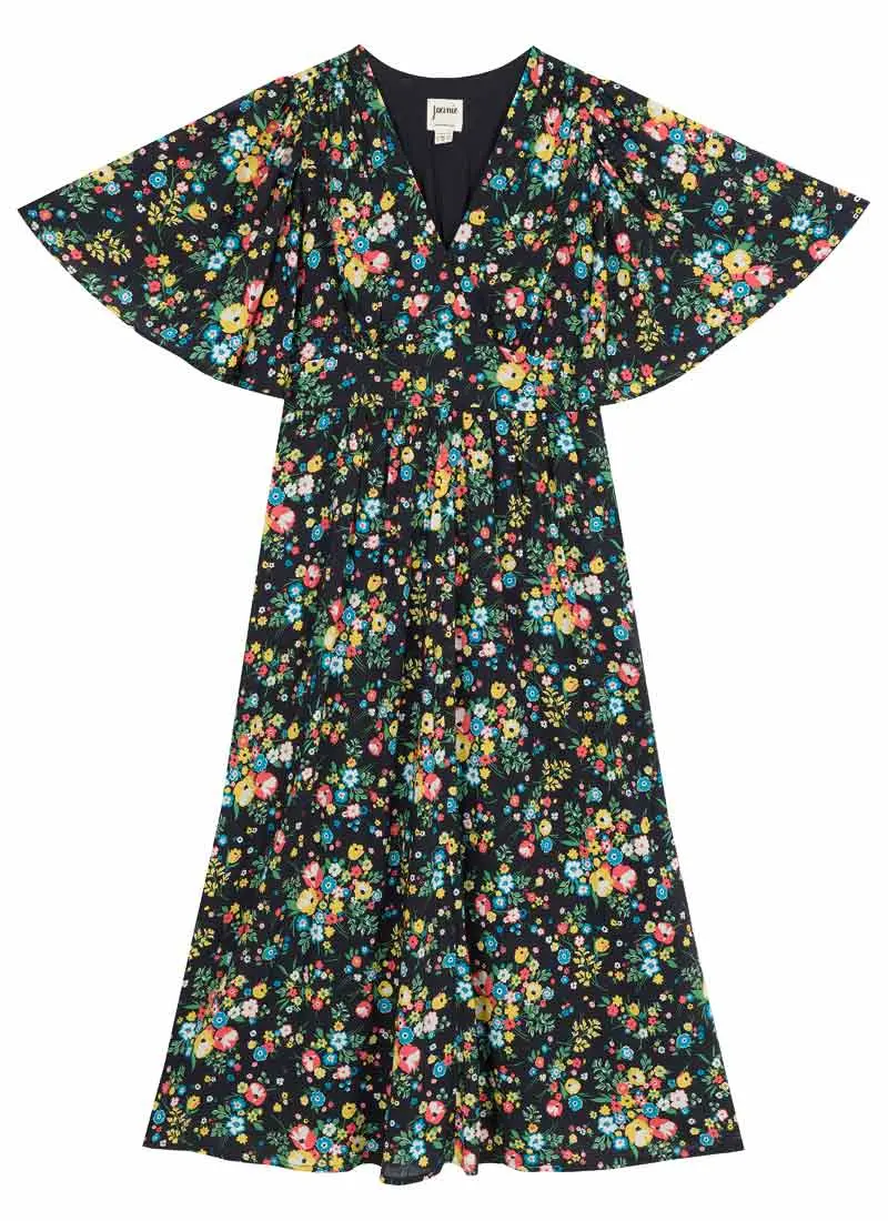 Meet Desdemona, your new go-to midaxi for easy transitional dressing! Crafted from a soft and floaty fabric in an all-over sporadic floral print on a black background, Desdemona features a V-neckline with shirring at the shoulders, wide angel sleeves, a shaped waist panel with gathers at the bust, a half sash belt and elasticated back waist panel to add shape, a side seam zip, and a midaxi-length skirt with pockets at the hips.Olive is 5’8.5” and is wearing a UK size 10Regular fit - take your usual sizeUK Size 10 dress length: 135cmSporadic multicoloured floral printAngel sleevesHalf sash beltSide seam zipMidaxi lengthPocketsFor specific measurements of this garment, please see the Size Guide.