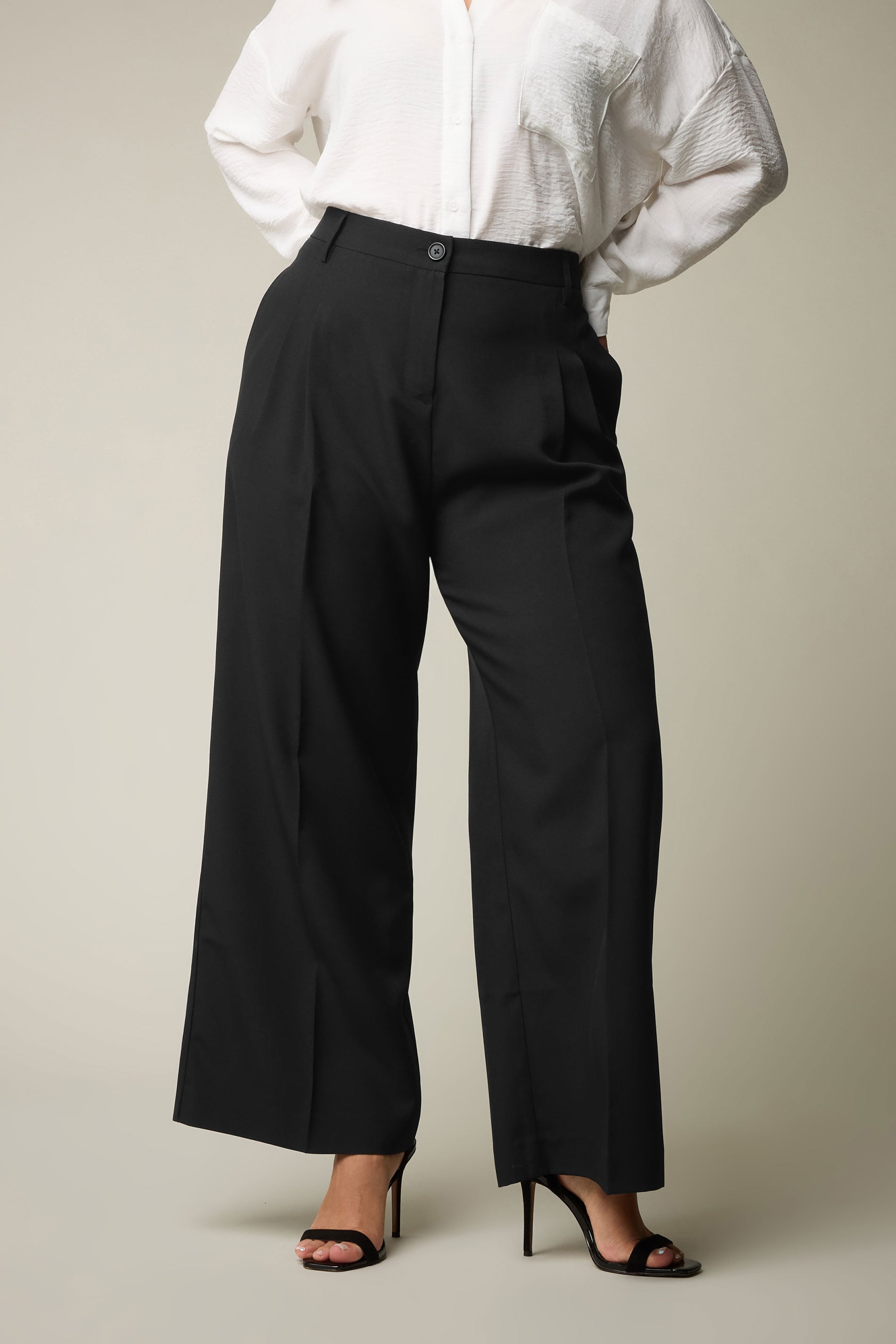 Welcome a workwear staple into your wardrobe with these must-have trousers! Made from a comfortable woven fabric, they feature a wide leg design, pleat front details, two side pockets, belt loops, and both a button and zip fastening. Pair with a cardigan and flats for the perfect office look. A staple pair of trousers!