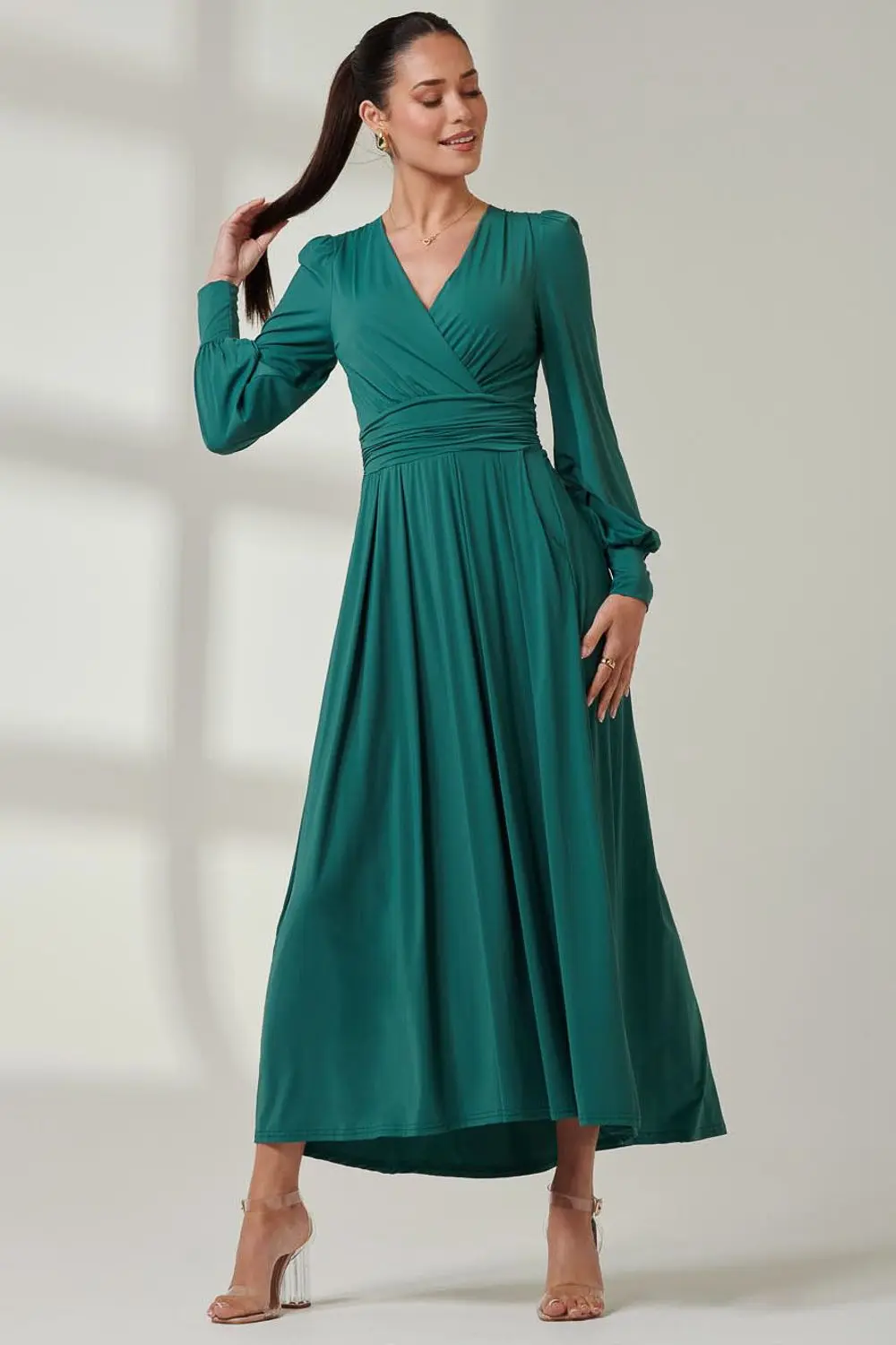 Indulge in comfort and sophistication with our Long Sleeve Super Soft Jersey Maxi Dress. Enhanced by a flattering v-neckline, handy pockets, and an adjustable waistband for a tailored fit. Crafted from plush, stretchy jersey fabric, ensuring all-day coziness. Elevate your style by accessorizing with bold jewellery and your go-to heels for a captivating evening look.