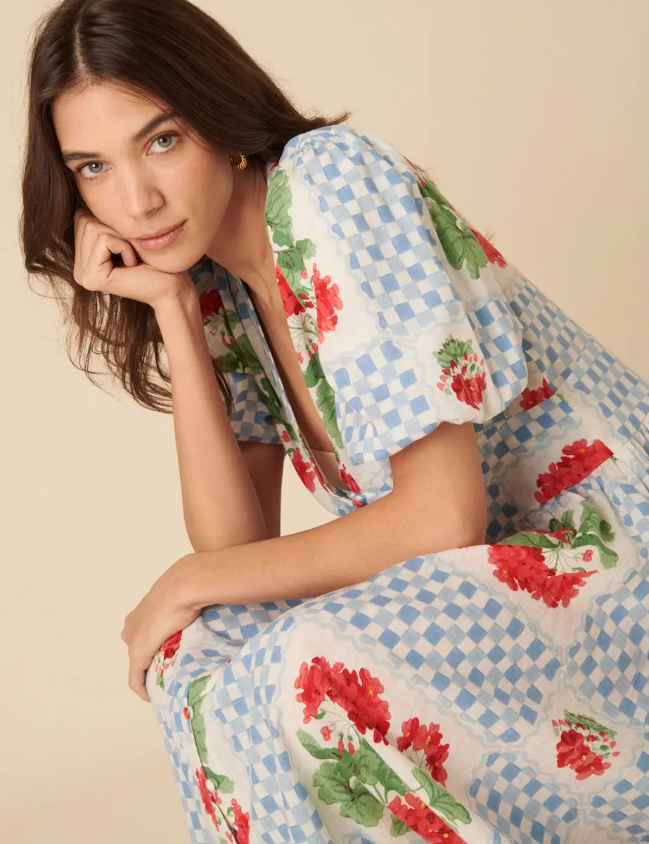 Meet our iconic style: Starlight. In a new vintage-inspired print that combines our love for both gingham and florals, she's perfect for summer days. We love her soft gathering, puff sleeves and pretty line of covered buttons - she's even got pockets. Just add suede boots. Low v-neck Short puff sleeves Covered buttons Panelled waist designed to flatter A-line skirt that skims the body Size tip: we recommend your usual size