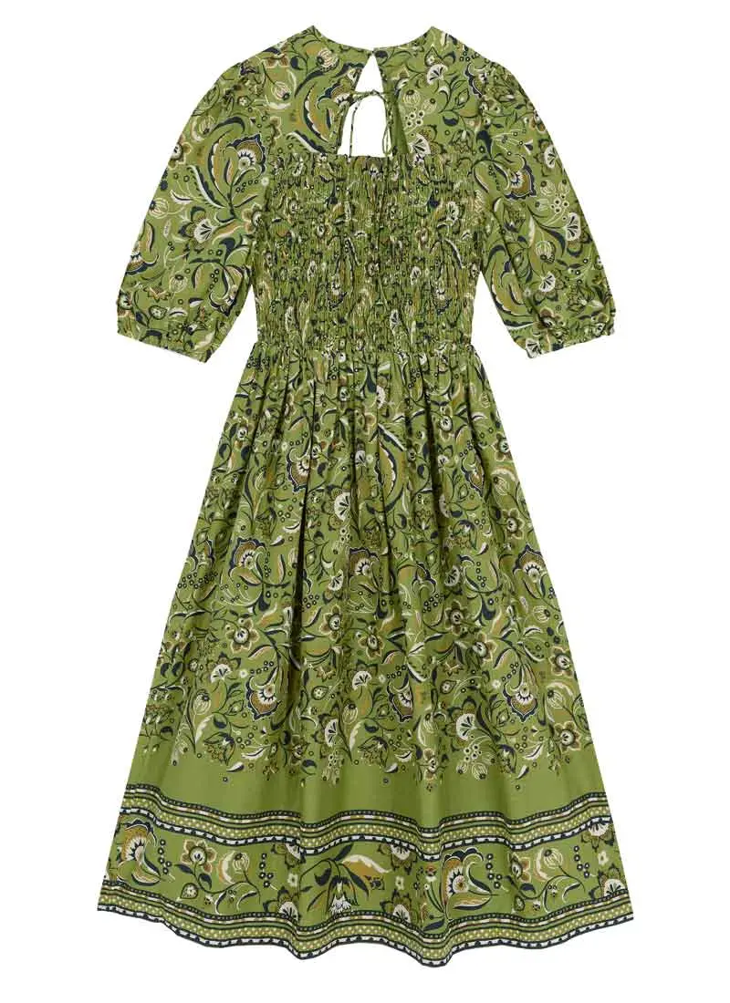 Dreamy green! Jesse is back in a brand-new vintage handkerchief print that’s bound to make the rest of your wardrobe green with envy. Crafted from super-soft organic cotton, this easy-going midi features a statement tie neckline, a shirred bodice with a rouleau loop keyhole back neck fastening, elasticated puff sleeves, border print detail around the hemline, and pockets at the hip.Laura is 5’11” and is wearing a UK size 10Elina is 5’11” and is wearing a UK size 16Regular fit - take your usual sizeUK Size 10 dress length: 124.5cmOrganic cottonAll-over vintage-inspired handkerchief printBow tie necklineBorder print detailPuff sleevesPocketsFor specific measurements of this garment, please see the Size Guide.