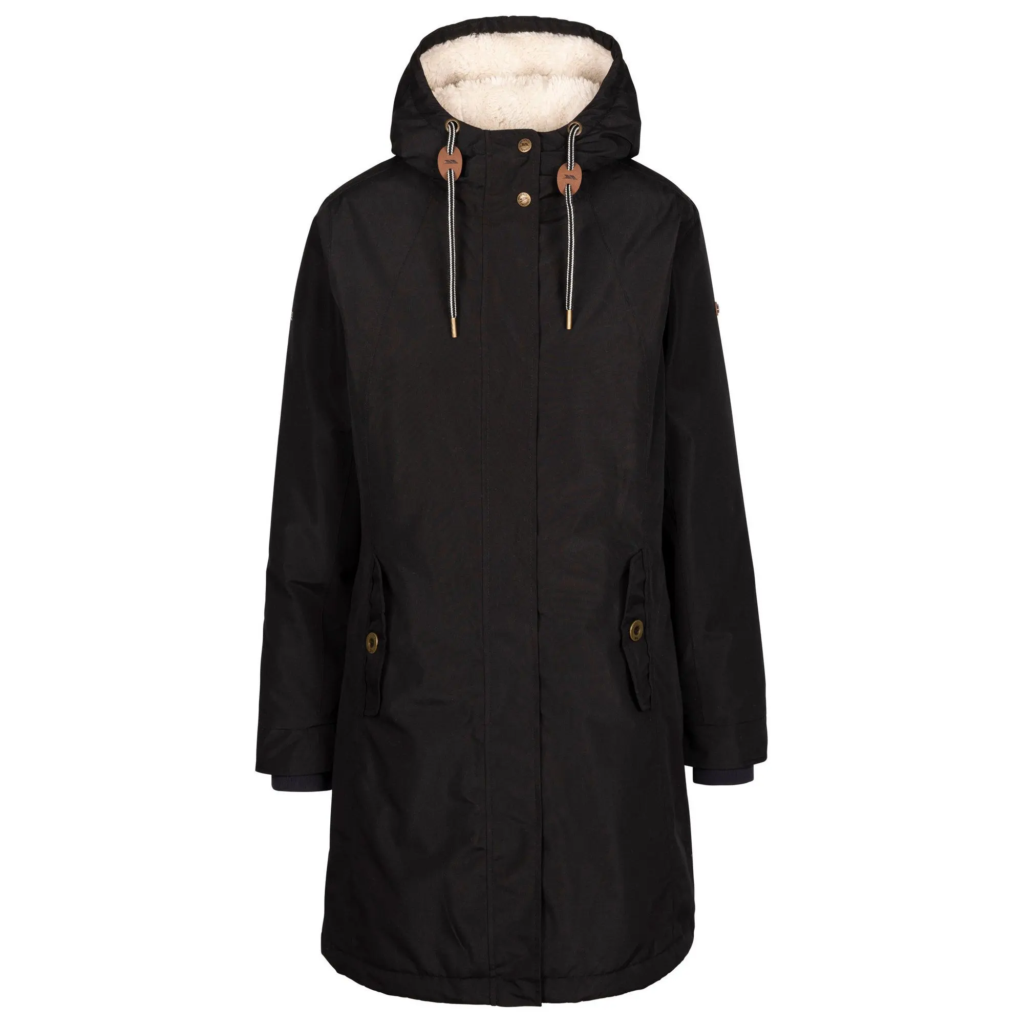 100% Polyester. Fabric: Microfibre, Peached, TPU Membrane. Lining: Sherpa Fleece. Design: Plain. Fabric Technology: TP50, Waterproof, Windproof. Brass Metal Trims, Elastic Panel, Taped Seams. Neckline: Hooded. Cuff: Inner Ribbed. Sleeve-Type: Long-Sleeved. Hood Features: Adjustable, Drawcord, Grown On Hood. Length: Long. Pockets: 2 Side Pockets. Fastening: Full Zip, Stormflap. Waterproof Rating: 5000mm. XXS: 31 in. XS: 32 in. S: 34 in. M: 36 in. L: 38 in. XL: 40 in. XXL: 42 in. 3XL: 44 in.