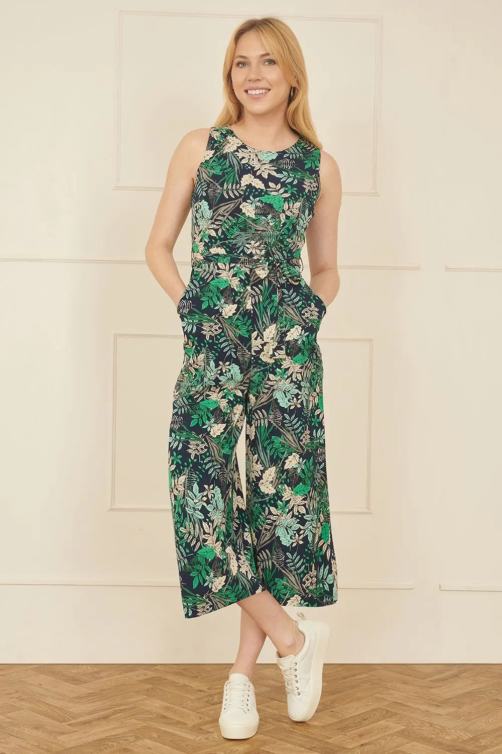 Cut in a classic silhouette, this Yumi Leaf Culotte Jumpsuit is the perfect way to bring summer style to your wardrobe. Featuring a semi-fitted bodice with a round neckline, the soft-touch fabric secures at the waist with a self tie belt.. The culotte trousers add a comfortable edge to your wardrobe and can be dressed up or down depending on the occasion.