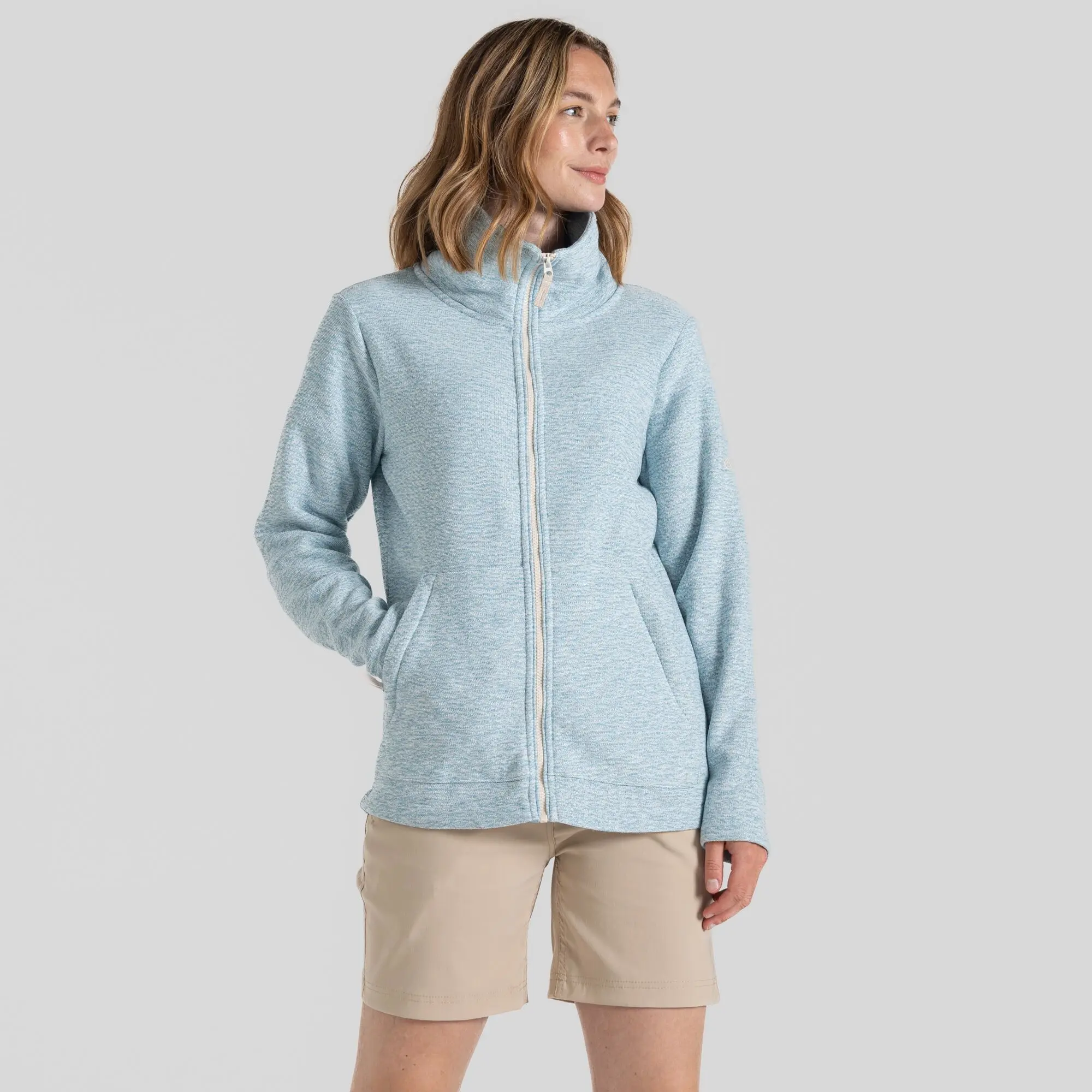 Aio is a great choice for easy-care insulation this season. Made from polyester melange knitlook fleece, the jacket features a full-length centre front zip with kangaroo-style pockets and a hidden zipped pocket.