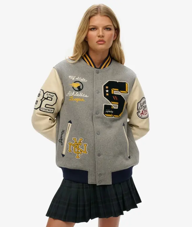 Superdry Women's Oversized College Patched Bomber Jacket Grey / Grey Marl -