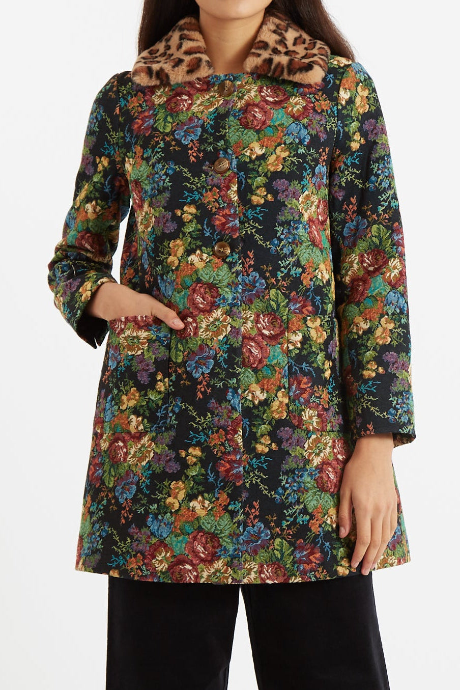 We've mixed up you favourite Dryden A-line coat, and crafted it in a winter floral woven jacquard with an oh so soft faux leopard fur collar and lux lining, making it a statement piece that will level-up any outfit!. 100% POLYESTER JACQUARD LINING 100% ACETATE. Dry Clean Only.. Model wears size 8, 5ft9 / 176cm