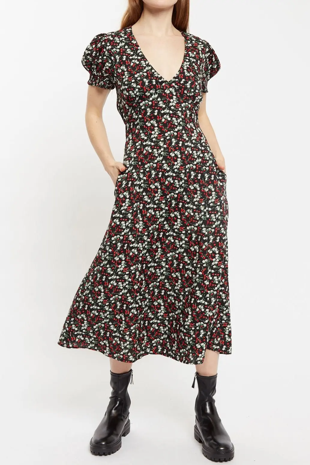 Meet Minerva we are sure your going to be great friends. Crafted in a black based ditsy print this midi dress its easy to style with boots or trainers. Featuring a flattering V neckline, waist defining back elastic, super cute puff sleeves and those essential side seam pockets.. 100% VISCOSE. Hand wash. Wash with similar colours. Do not bleach. Do not tumble dry. Warm Iron on reverse.. Model wears size 8, 5ft7 / 170cm