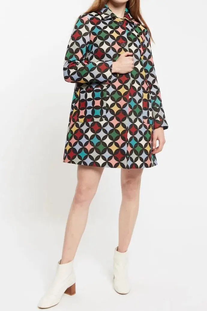 The Dryden is a retro styled, versatile A-line coat featuring a button fastening and patch pockets. Reimagined in an intricate woven jacquard fabric with a circle design inspired by the 60's. A statement piece that will level-up any outfit!. 40%COTTON / 60% POLYESTER JACQUARD. Dry Clean Only.. Model wears size 8, 5ft7/ 170cm