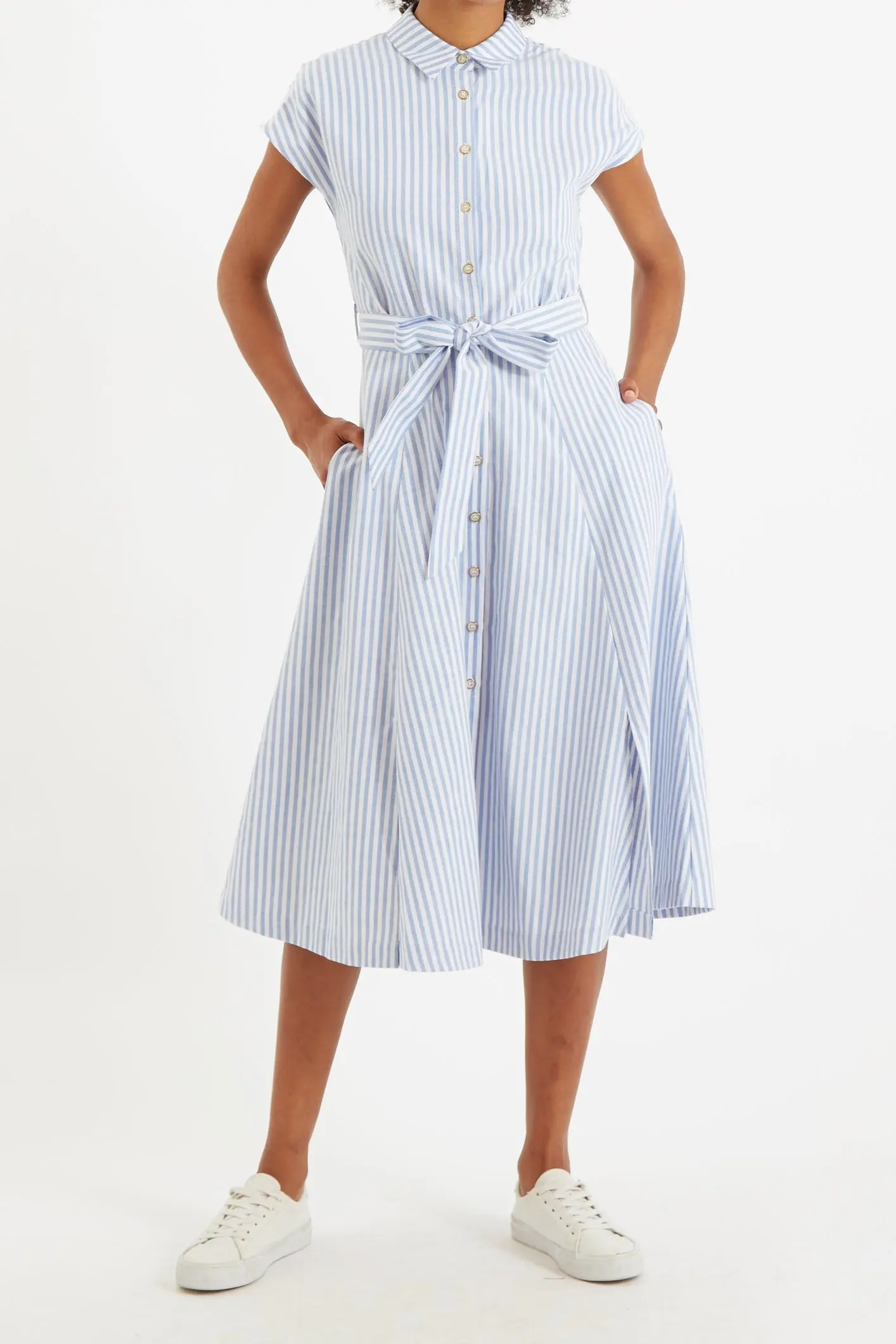 Fleur is a perfect do-it midi shirt dress with a difference. Crafted in a medium weight light blue and white stripe Features include a flattering cuffed extended shoulder, comfy elasticated back waist, slits to front and deep side seam pockets.. 35% COTTON 65% POLYESTER. 30°C machine wash. Wash with similar colours. Do not bleach. Do not tumble dry. Cool iron on reverse.. Model is 5ft 7" / 174cm tall and wears a size 8