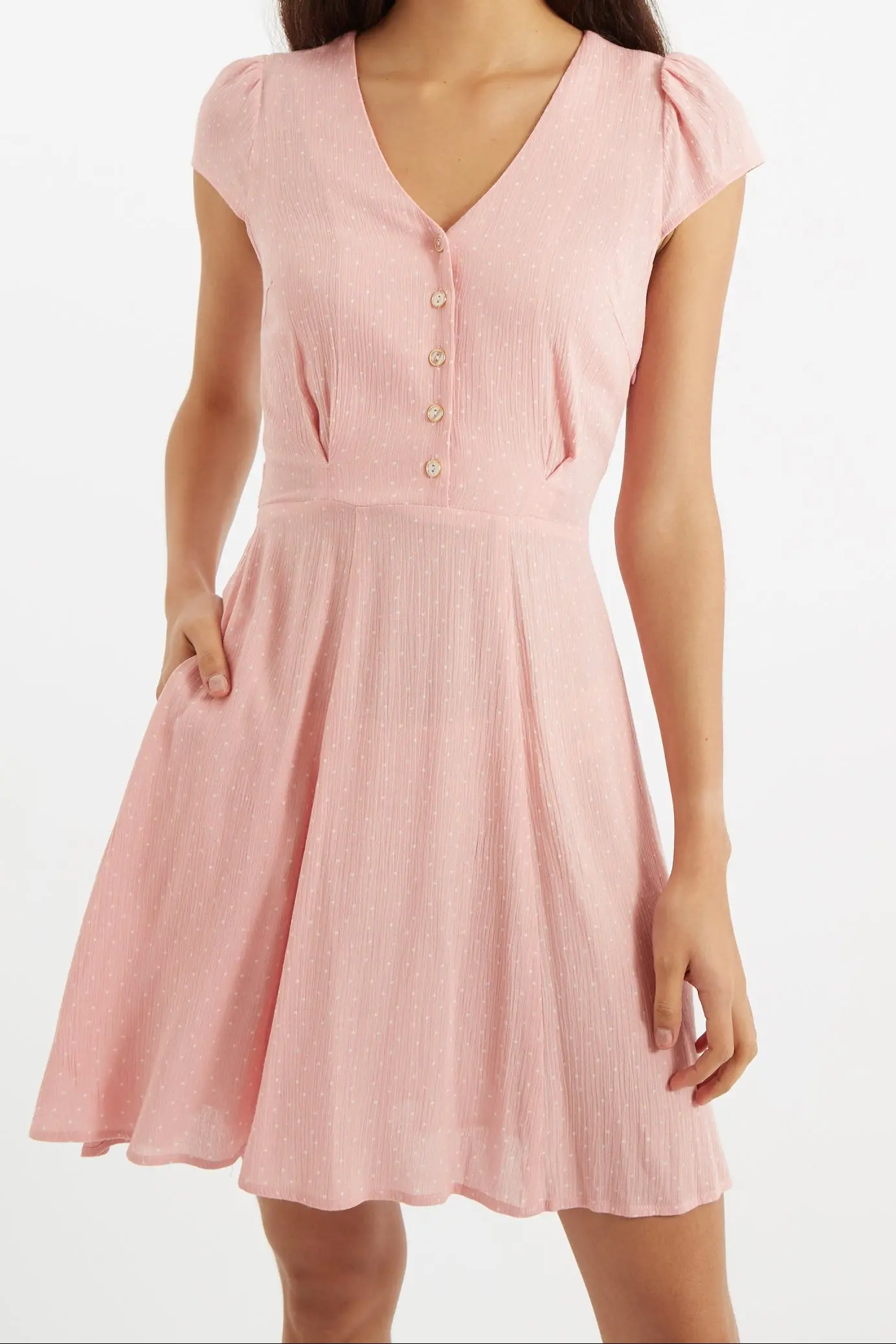 Inspired by a vintage tea dress our favourite Cathleen dress will serve you well for seasons to come. This shape is simply the most flattering shape ever. Crafted in a pale pink crepe printed with tiniest dot. Featuring cap sleeves, a fitted bodice with gold-edged buttons, a back tie waist to customise your fit and of course those deep side seam pockets which we all truly love. Style with sandals or trainers and let her be your forever dress.. 100% VISCOSE CRINKLE CREPE. Hand wash. Wash with similar colours. Do not bleach. Do not tumble dry. Warm Iron gently on reverse.. Model is 5ft 8" / 174cm tall and wears a size 8