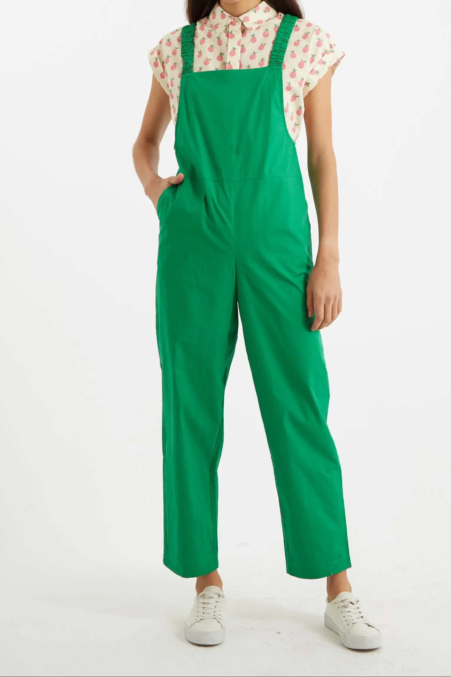 We always spend time designing that must have wardrobe essential. Creating the perfect dungarees was in many ways challenging. Fitted again and again for comfort and fit we feel we have cracked it and await your comments. Crafted in a superior high count cotton. Featuring elasticated straps (yes they stay on your shoulders) that offer comfort a straight leg which looks good turned up and deep pockets. Pair with a favourite tee, sweater or our Abinaya shirt for a casual breezy vibe.. 100% COTTON. Cool machine wash. Wash with similar colours. Do not bleach. Do not tumble dry. Warm iron on reverse.. Model is 5ft 8" / 173cm tall and wears a size 8