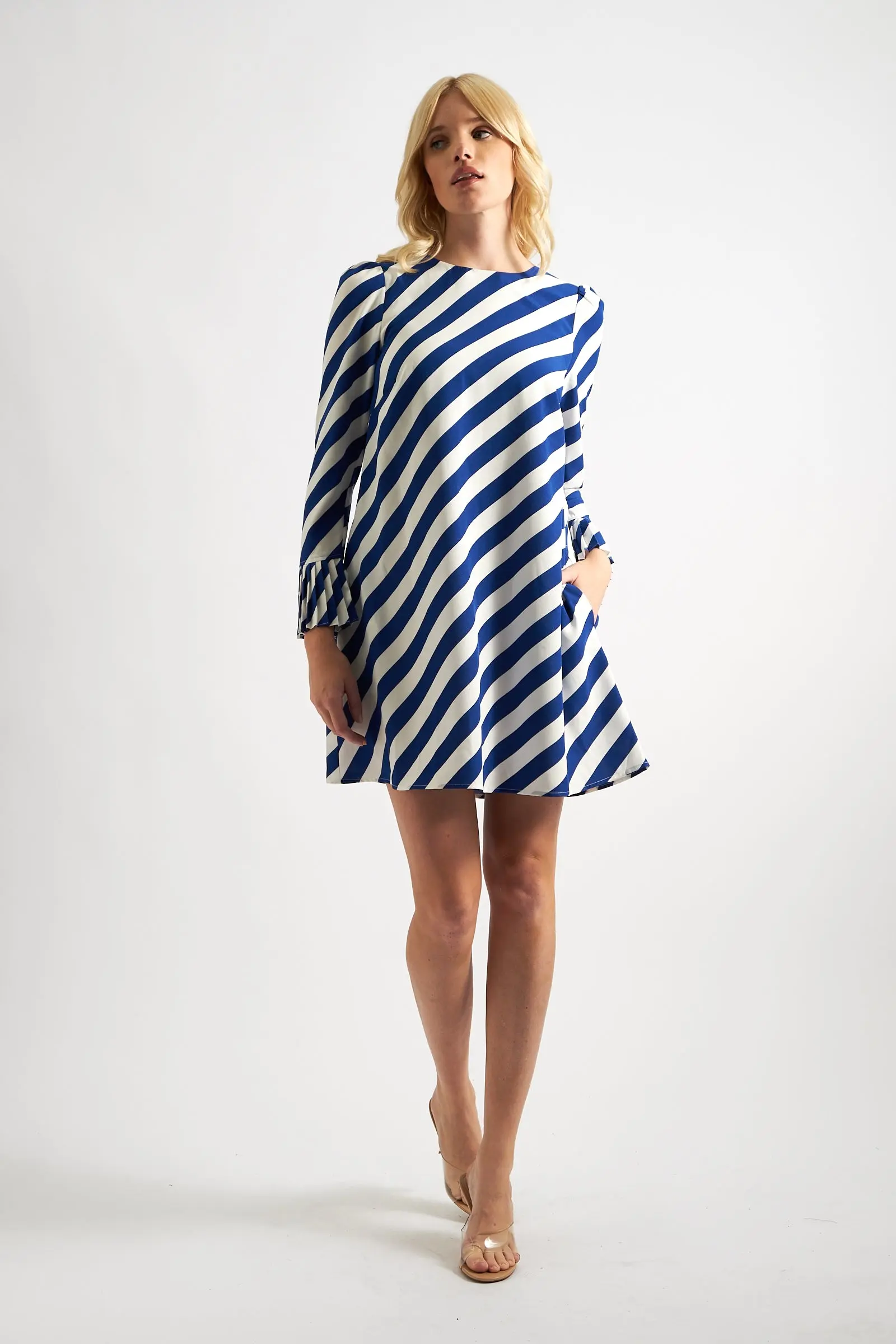 Stand out in the Megann Diagonal Lines print mini dress! The bold, retro inspired design features a flattering blue and white diagonal stripe print with statement pleated cuffs and handy side seam pockets for added style and convenience. Make a statement in this dramatic and playful A-line mini dress.. 100% POLYESTER 100% POLYESTER GEORGETTE LINING. Turn inside out. Machine wash in warm water with similar colours. Do not bleach. Do not tumble dry, Simply hang on a hanger to dry. Cool iron. Do not dry clean.. Model is 5ft 9"/175cm tall and wears size 8 UK