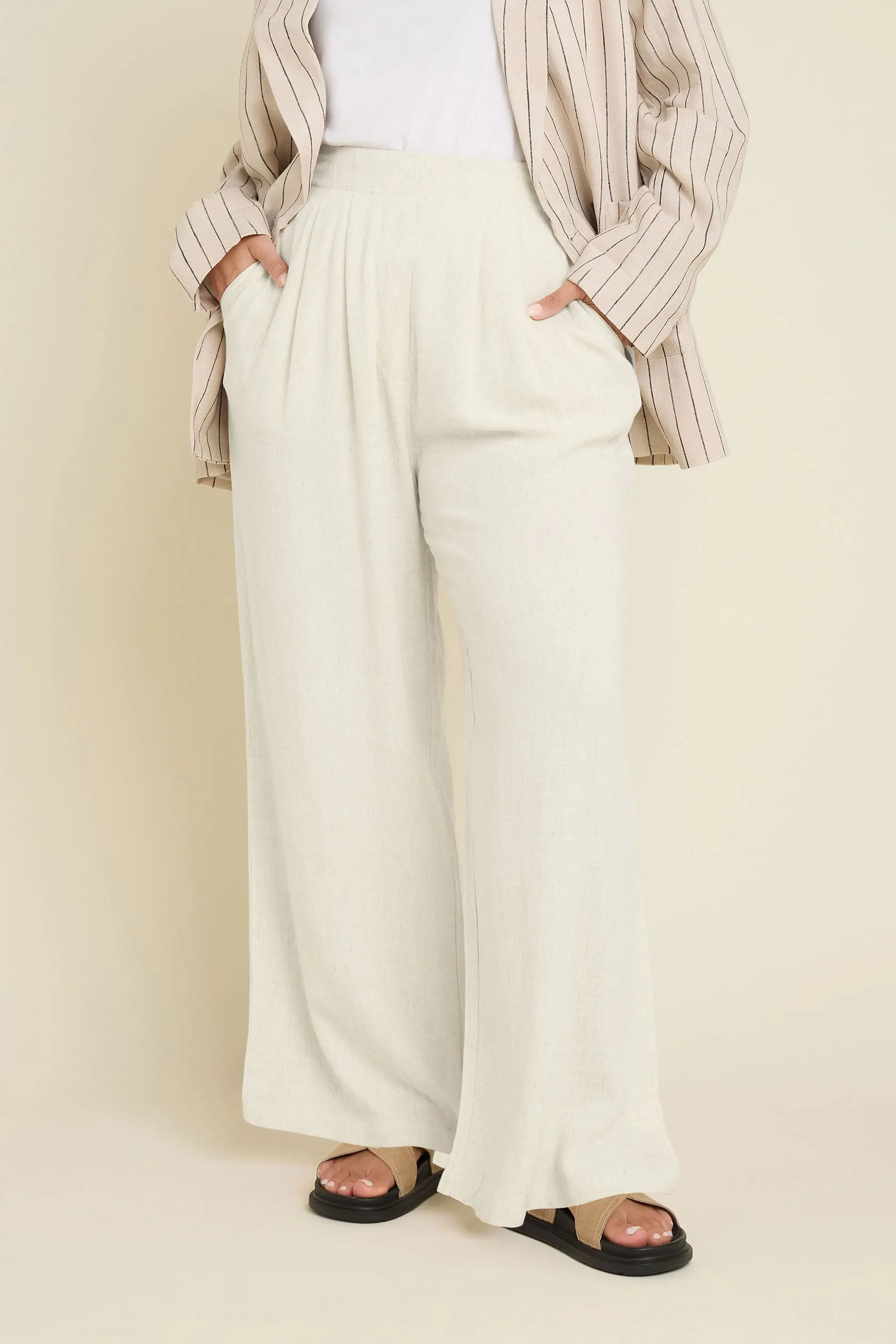 Welcome a smart pair of trousers into your summer wardrobe with this must-have linen style! Made from a soft woven fabric, they feature a pleat front detail, an elasticated waistband with dart details, two side pockets, and a wide leg style. Pair with a t-shirt and sandals for an elevated everyday look! The trousers your wardrobe has been looking for!