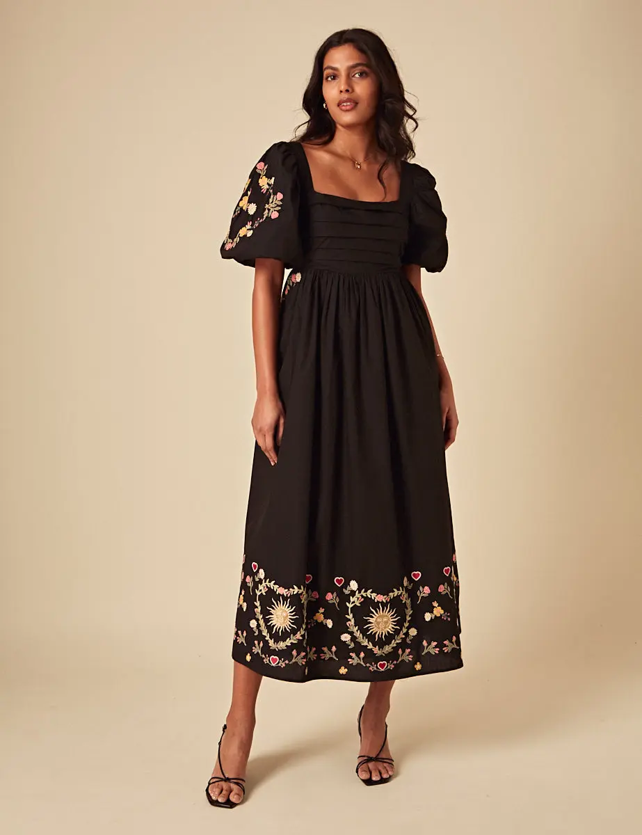 Elizabeth Scarlett Black Floral Embroidered Nova Midi Dress