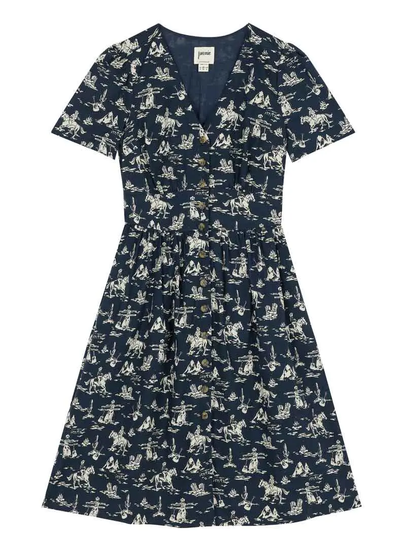 This isn’t our first rodeo. The Natalie Dress is made from textured organic cotton with a hint of added stretch for comfort in an all-over illustrated country and western design depicting cowgirls, cacti, horses, and more on a navy blue background. Featuring a V-neckline, short sleeves, a functional button-down front with a fitted under-bust panel to add shape, and a gently pleated midi-length skirt with pockets at the hips, this easy-going day dress is here to make transitional dressing a breeze.Abigail is 5'10 and is wearing a UK size 10Sha is 5'10 and is wearing a UK size 16Regular fit - take your usual sizeUK Size 10 dress length: 110cmTextured organic cottonAll-over country and western designV-necklineShort sleevesMidi lengthPocketsFor specific measurements of this garment, please see the Size Guide.