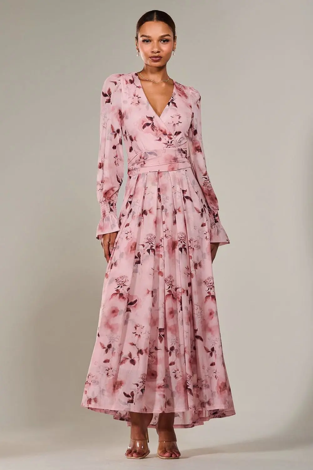 Fall in love with the Long Sleeve Mesh Maxi Dress from Jolie Moi. This feminine, floaty piece is the perfect addition to your summer into autumn wedding wardrobe, with its long ruffle sleeves that are shirred at the wrist for the perfect flared effect. The soft mesh fabric makes this dress breathable and airy, whilst having a pleated maxi skirt with a slightly dipped hem, as well as a flattering ruched waistband and tie belt. It also has a faux wrap v neckline and pleating on the shoulders which is an added touch to make this dress even more perfect. The side front pockets and make this dress practical, with the over head fastening adding extra comfort to this beautiful dress.