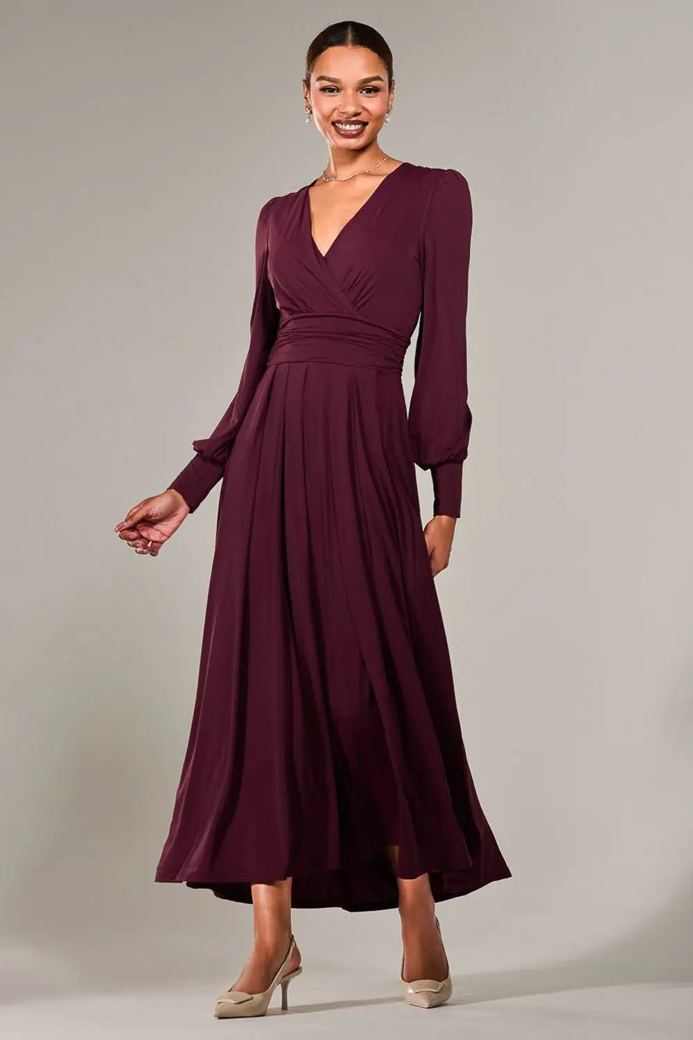 Embrace elegance with our Long Sleeve Super Soft Jersey Maxi Dress from Jolie Moi. This dress is the perfect staple for your occasion wardrobe, from formal occasions to bridesmaids, made from the softest jersey, which sits against the body beautifully, with a floaty maxi skirt and long sleeves that gather at the wrists. The stretch fabric makes this piece really flattering and comfortable, with a thick ruched waistband, which cinches you in perfectly at the waist, as well as a v-neckline. This dress is sophisticated and stylish whilst also being practical, featuring front side pockets and no zip, making it easy to wear.