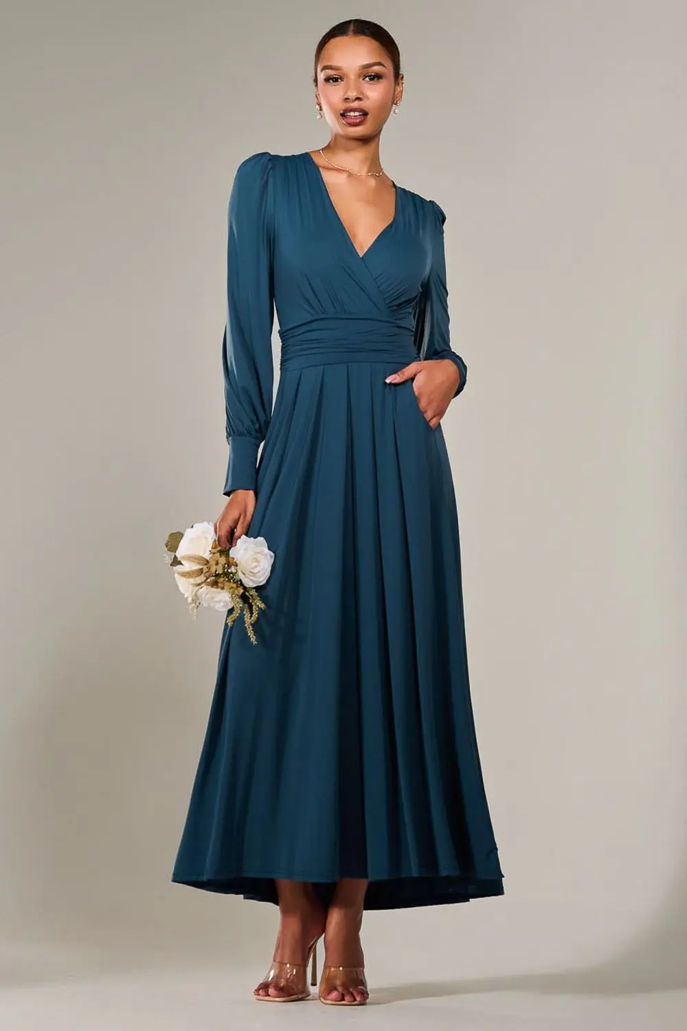 Embrace elegance with our Long Sleeve Super Soft Jersey Maxi Dress from Jolie Moi. This dress is the perfect staple for your occasion wardrobe, from formal occasions to bridesmaids, made from the softest jersey, which sits against the body beautifully, with a floaty maxi skirt and long sleeves that gather at the wrists. The stretch fabric makes this piece really flattering and comfortable, with a thick ruched waistband, which cinches you in perfectly at the waist, as well as a v-neckline. This dress is sophisticated and stylish whilst also being practical, featuring front side pockets and no zip, making it easy to wear.