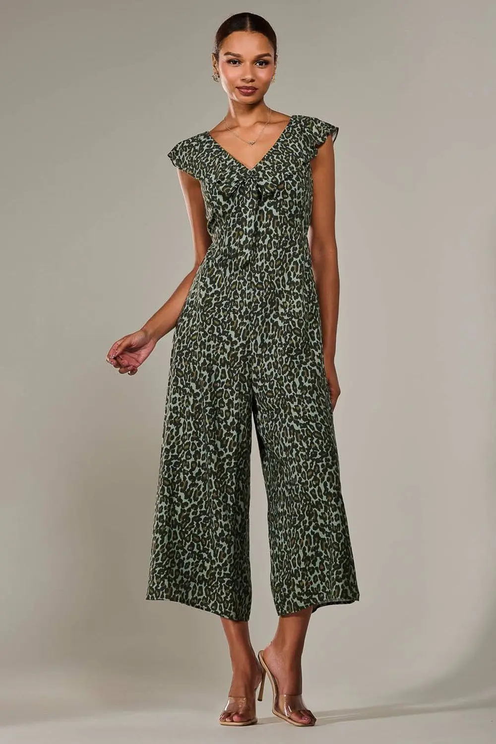 Jolie Moi Women's Frill Tie-front Jumpsuit in Dark Green