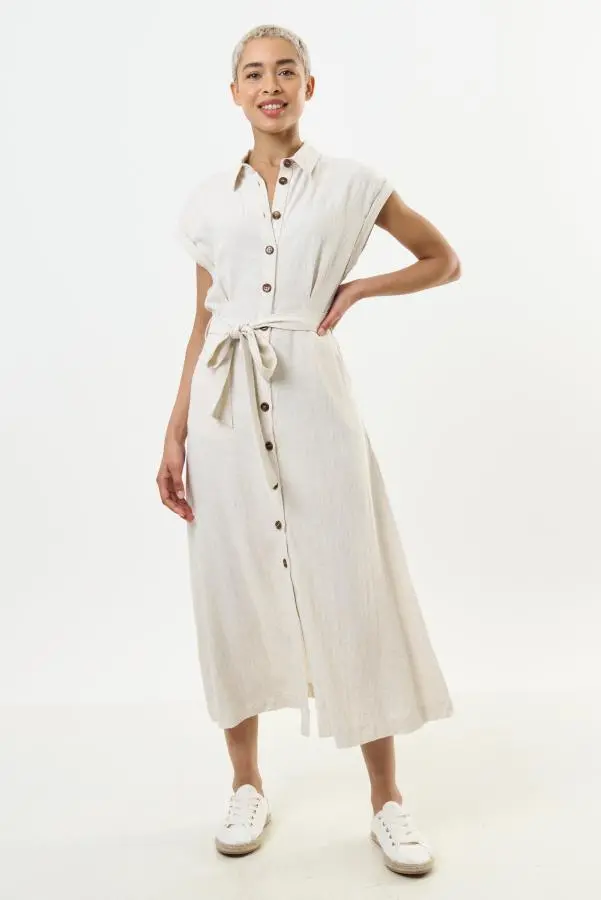 Elevate your summer wardrobe with our Reese Linen Mix button through midi shirt dress. Designed for effortless style, this relaxed fit navy dress features cuffed extended shoulders and a tie waist for a flattering silhouette. Made from a soft linen mix, soon to be your wear on repeat forever dress!. Shirt collar.. Self tie belt.. Side seam pockets.. Wooden buttons.. 30% LINEN, 70% VISCOSE. Hand wash. Wash with similar colours. Do not bleach. Do not tumble dry. Warm Iron on reverse.. Model 5ft 8"/ 173 cm and wears UK 8