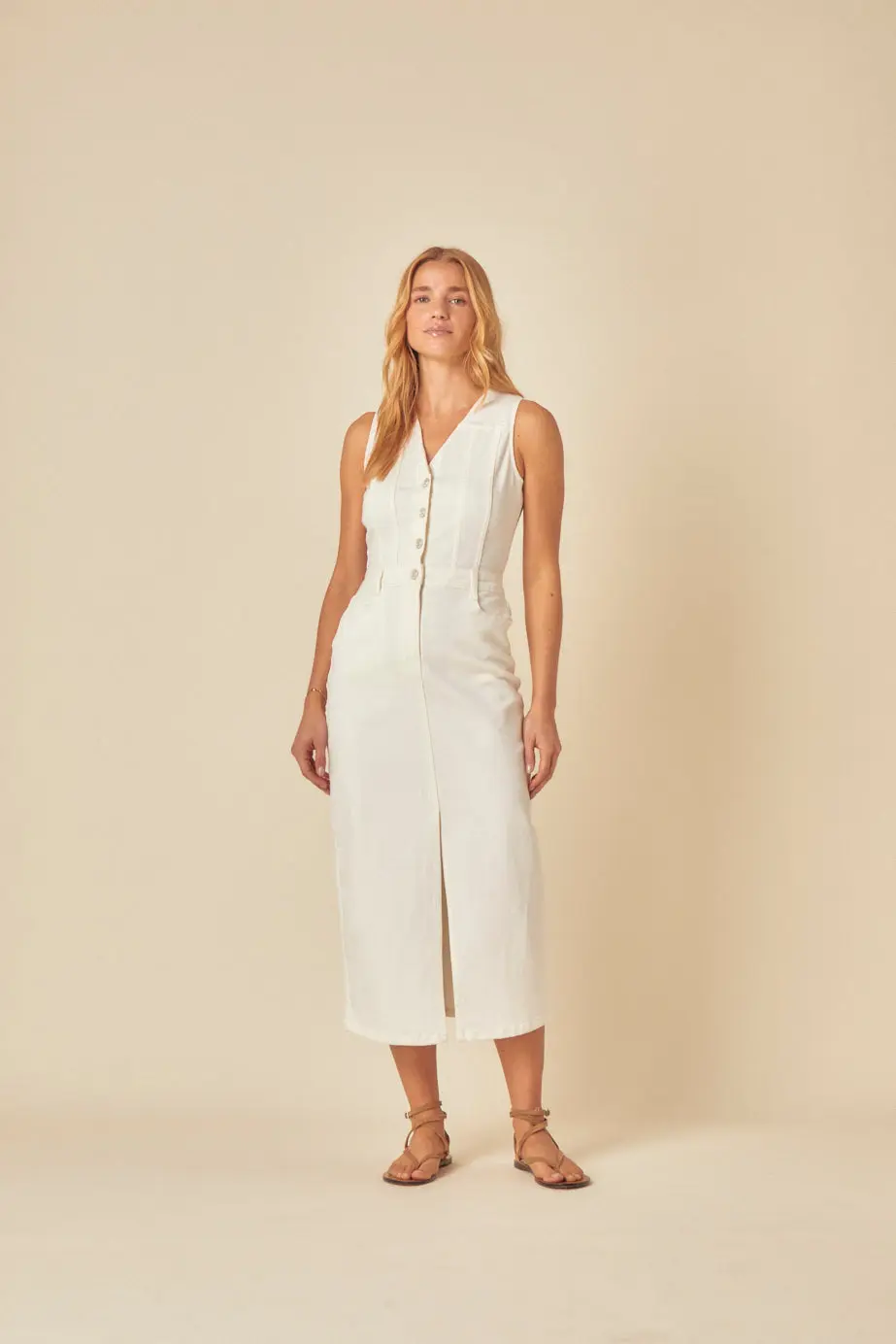 Your new go-to. With a V-neck, button detailing, pockets, and seam details, this white denim dress has all the right touches. Plus, a front slit at the maxi skirt for the perfect finish. V-neck Button front Pockets Centre slit Designed to be semi-fitted Size tip: we recommend your usual size