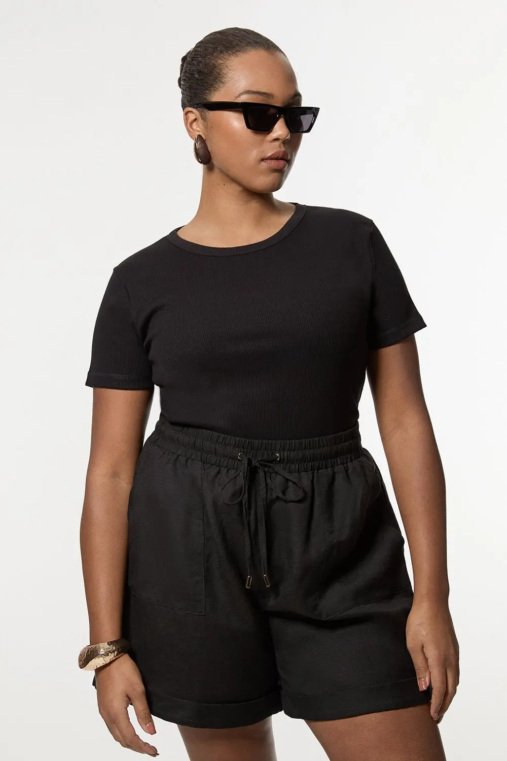 Plus Size Viscose Linen Tie Waist Woven Short - Black - Elevate your warm weather wardrobe in our plus size shorts, with a wide leg silhouette, a statement print, and pockets. The lightweight linen fabric makes for a piece perfect for wearing from wandering city streets to lounging at the beach. Style it with anything, from the matching shirt for an elevated look that will take you seamlessly from day to night, to a T-shirt for a more relaxed approach. Plus Size Viscose Linen Tie Waist Woven Short High Quality Linen Fabric Flattering Relaxed Fit Comfortable High Waistline Pocket Features Drawstring Waistband Matching Pieces Sold Separately Expertly designed for those UK size 18/US size 14 and above, our plus size clothing collection is perfectly proportioned to ensure you look stylish at every shape.