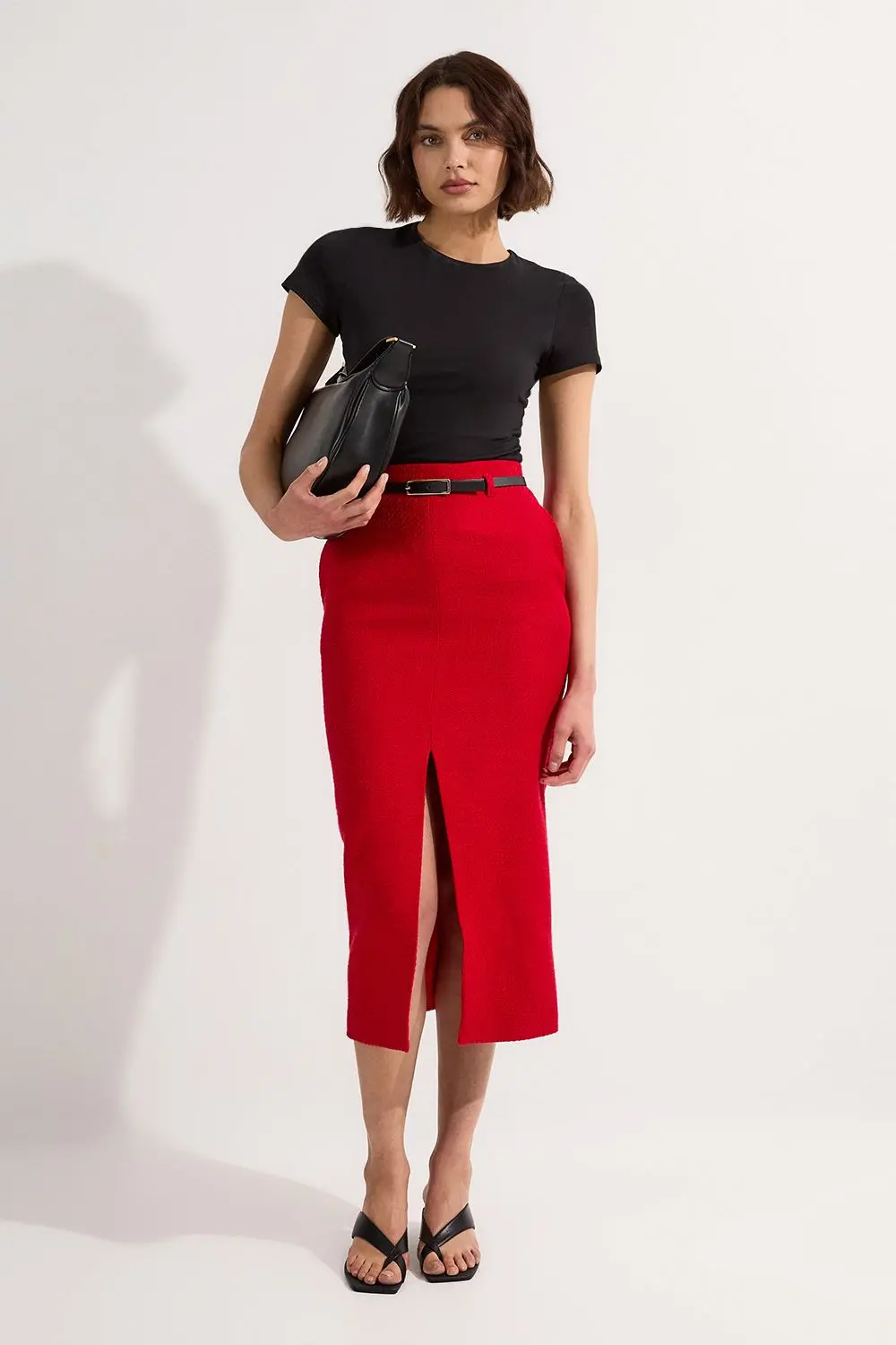 Textured Tweed Tailored Pencil Skirt - Red - This Karen Millen Textured Tweed Tailored Pencil Skirt is a versatile wardrobe staple that effortlessly transitions from day to night. The timeless tweed fabric adds texture and interest, while the tailored pencil shape creates a sleek silhouette. Style it for a casual daytime look by pairing it with a crisp white shirt and flat sandals, as seen on the model. For family gatherings or lunch with friends, team it with a soft knit jumper and ankle boots. The front slit allows for comfortable movement, making it ideal for various casual events. The functional side pockets add practicality, while the belt loops offer the option to customise your look with different belts. This skirt's classic design ensures it will remain a go-to piece in your wardrobe for seasons to come, perfect for creating polished yet relaxed outfits for a range of casual occasions. Textured tweed fabric for a classic, sophisticated look Tailored pencil silhouette for a flattering fit Front slit detail for ease of movement Functional side pockets with button closure Slim belt loops for versatile styling options