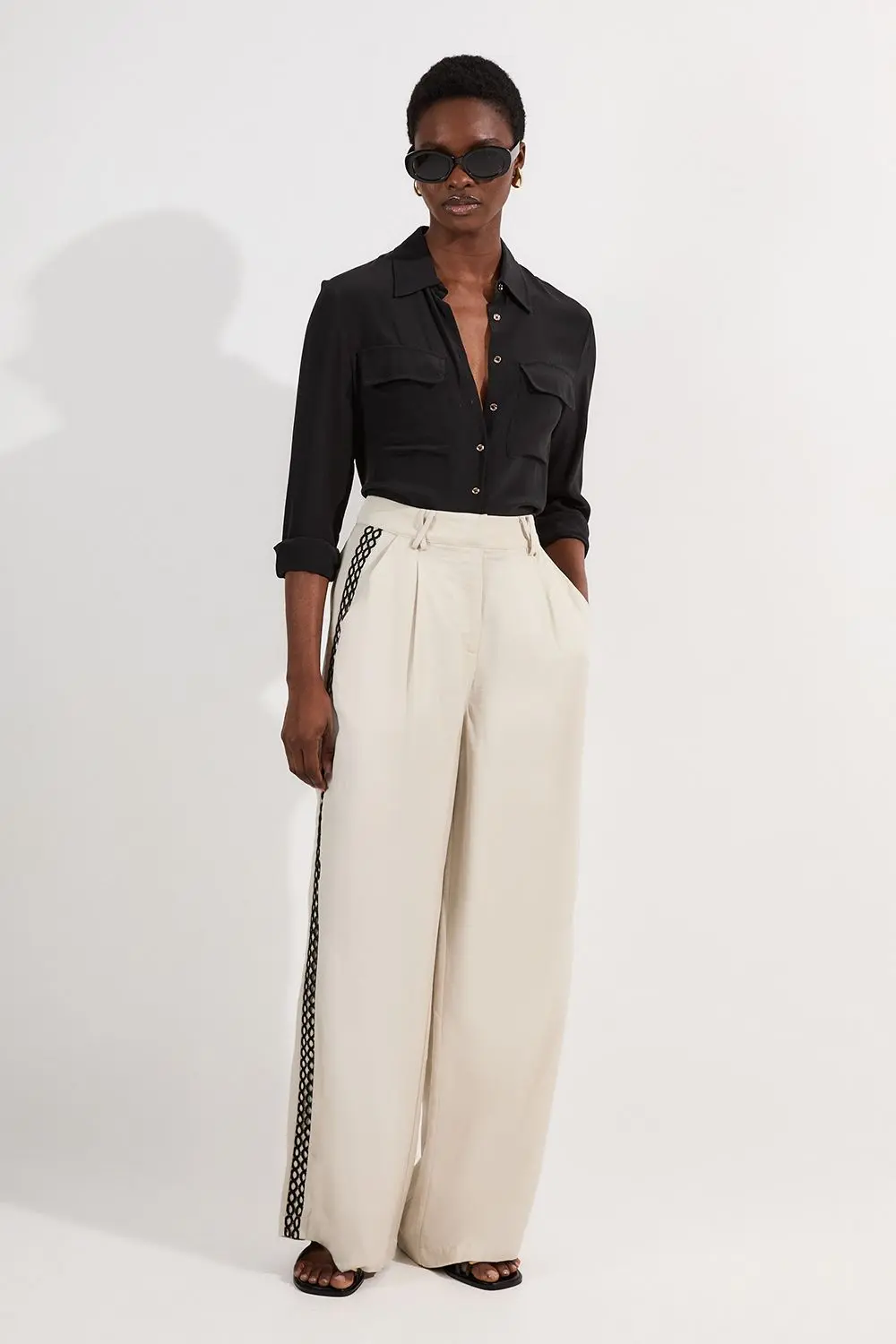 Viscose Linen Lace Trim Insert Woven Trouser - Brown - These Karen Millen viscose linen blend trousers combine relaxed daywear comfort with distinctive design elements. The contrasting lace trim inserts create a striking visual interest along the full length of each leg, while the wide-leg silhouette ensures a contemporary, flowing aesthetic. The high-rise waist with subtle pleating creates a flattering silhouette that pairs with both fitted and loose tops. These versatile trousers transition seamlessly from day to evening, simply swap your flat sandals for a block heel and add statement jewellery for dinner dates. The linen-mix fabric offers a natural drape that moves gracefully with every step, making these trousers a standout addition to your casual wardrobe. Loose-fit woven trousers with lace trim inserts along the side seams Wide-leg silhouette High-rise waistband with pleated front detail Sophisticated side belt loops and clean-lined pockets