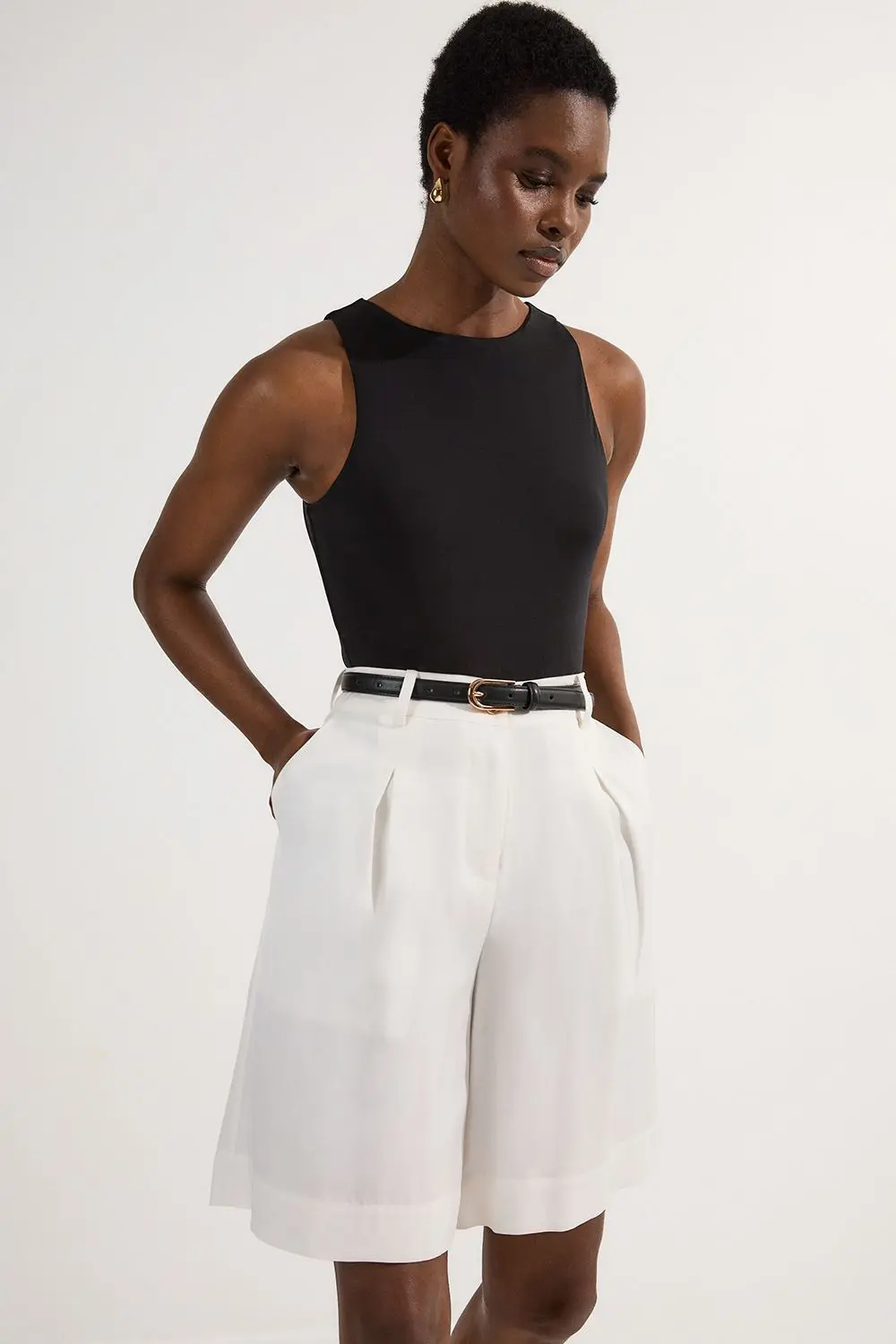 Premium Viscose Linen Belted Woven City Short - White - These Karen Millen city shorts blend timeless sophistication with practical daywear comfort. The thoughtfully designed pleats create a structured yet relaxed silhouette that flatters your natural shape, while the included belt adds definition to your waist. Style these versatile shorts with a fitted ribbed vest top and flat leather sandals for casual weekend brunches, or pair with a crisp cotton shirt and trainers for city explorations. The lightweight fabric drapes beautifully, making these shorts ideal for warm-weather gatherings or holiday sightseeing. For transitional seasons, layer with a lightweight knit jumper and ankle boots. These shorts work brilliantly for family gatherings, casual lunch dates, or museum visits, offering the perfect balance of comfort and understated elegance for your daytime wardrobe. Elegant woven city shorts with a sophisticated belted design Flattering high-waisted silhouette with front pleats for added structure Practical side pockets perfect for everyday essentials Versatile mid-thigh length offering both comfort and style Secure single-button fastening with a refined metal eyelet detail