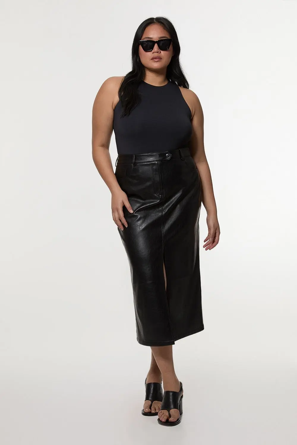 Plus Size Faux Leather Pencil Midi Skirt - Black - Embrace contemporary sophistication with this Karen Millen Plus Size Faux Leather Pencil Midi Skirt. The high-waisted design and figure-hugging silhouette create a polished look that's perfect for the modern woman. Style it with a crisp white blouse and pointed-toe flats for a chic daytime ensemble. The front slit adds a touch of allure while ensuring ease of movement, making it ideal for family gatherings or casual brunches. For a more relaxed vibe, pair it with a soft knit jumper and ankle boots. The versatile nature of this skirt allows for effortless transition from day to night, simply swap your flats for heeled sandals and add statement jewellery for an evening out. With its timeless appeal and expert craftsmanship, this skirt is set to become a staple in your wardrobe. Sleek faux leather pencil midi skirt Figure-hugging silhouette for a flattering fit Front slit for ease of movement Functional front pockets for practicality High-waisted design with belt loops
