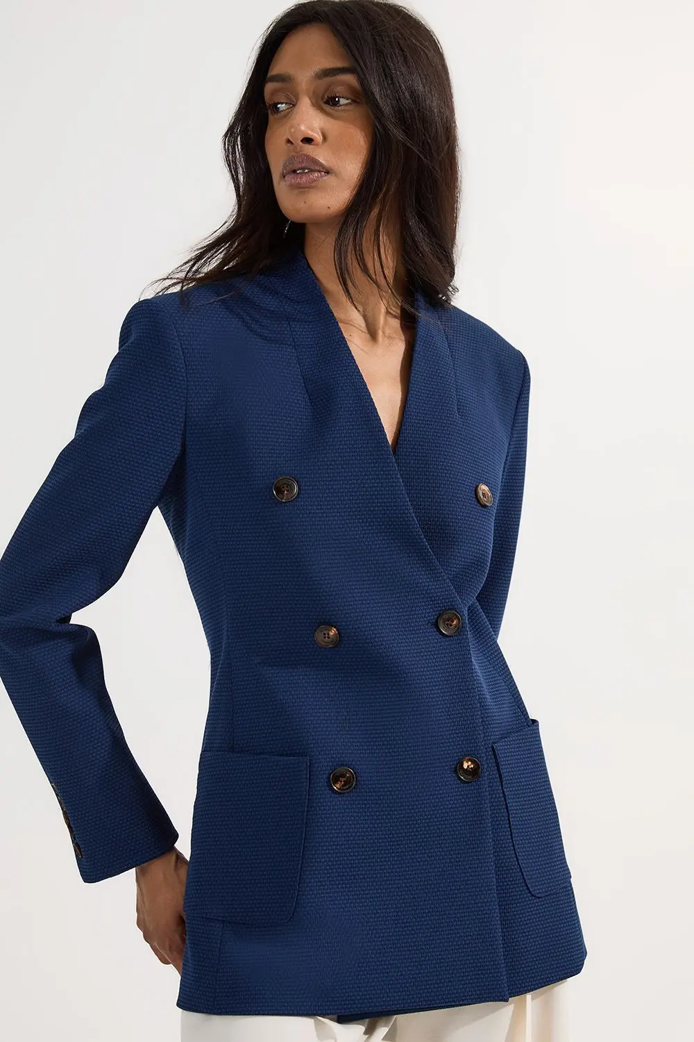 Tailored Textured Double Breasted Jacket - Navy - This Karen Millen Tailored Textured Double Breasted Jacket brings refined sophistication to your workwear collection. The textured woven fabric adds visual interest whilst maintaining a professional appearance, perfect for making an impression in the boardroom. Style with tailored white trousers as shown for a crisp, contemporary look, or pair with a pencil skirt and court shoes for traditional office elegance. The versatile regular fit ensures comfort throughout your busy day, whilst the structured silhouette creates a flattering shape that transitions seamlessly from day to evening. This jacket works brilliantly as part of a capsule wardrobe, complementing both formal ensembles and smart-casual combinations. For important presentations or client meetings, layer over a silk blouse and finish with understated jewellery for a look that conveys confidence and authority. Sophisticated double-breasted design with distinctive textured fabric Elegant collared neckline for a refined silhouette Practical patch pockets add functionality to this tailored piece Structured shoulders create a polished, professional profile Versatile regular fit allows comfortable layering over various outfits
