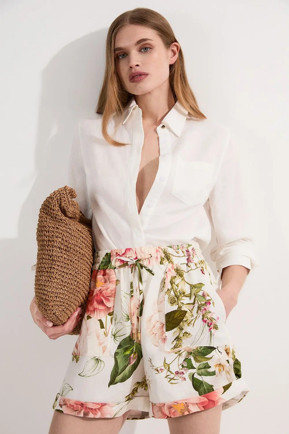Linen Viscose Woven Short - Floral - These Karen Millen woven shorts combine effortless style with warm-weather comfort. The botanical print creates a fresh, feminine aesthetic that pairs with crisp shirts or simple tees. Style with a classic white button-down for a polished daytime look. The lightweight fabric makes these shorts ideal for garden parties, coastal holidays, or city explorations during warmer months. Add a woven tote and oversized sunglasses to complete your ensemble. These versatile shorts transition seamlessly from daytime shopping to alfresco dining, offering the perfect balance of sophistication and casual charm for your summer wardrobe. Crafted from a linen-viscose blend Elasticated waistband with drawstring tie for adjustable fit Striking floral pattern Relaxed silhouette Side pockets
