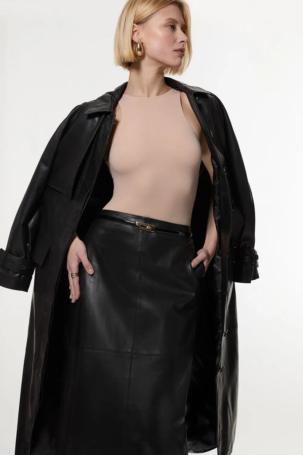 Petite Leather Clean Pencil Midi Skirt - Black - This Karen Millen leather pencil skirt embodies timeless sophistication with its clean lines and impeccable tailoring. The midi length strikes the perfect balance for petite frames, while the genuine leather construction ensures this piece will age beautifully with wear. Style with a fitted turtleneck and ankle boots for daytime elegance, or pair with a crisp blouse and pointed court shoes for formal occasions. For evening events, match with a silk camisole and statement jewellery to create a refined ensemble that commands attention. The structured silhouette flatters the figure whilst maintaining comfort for all-day wear. This investment piece will serve as the foundation for countless outfits, making it an essential addition to any curated wardrobe for years to come. Crafted from genuine leather for a luxurious feel and exceptional durability Clean pencil silhouette with a flattering midi length Subtle panel detailing adds structure and visual interest Sleek, minimalist design with a smooth finish